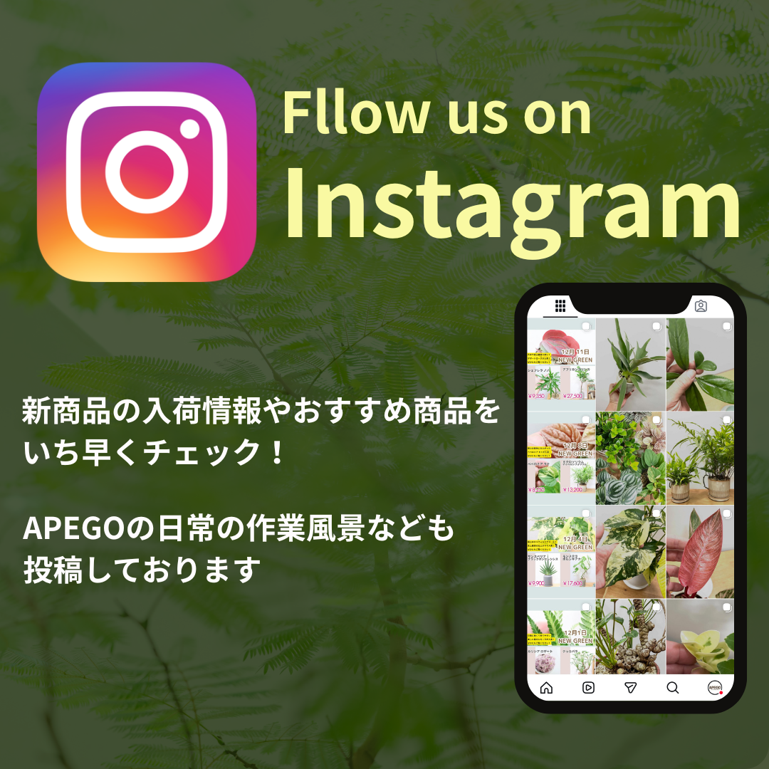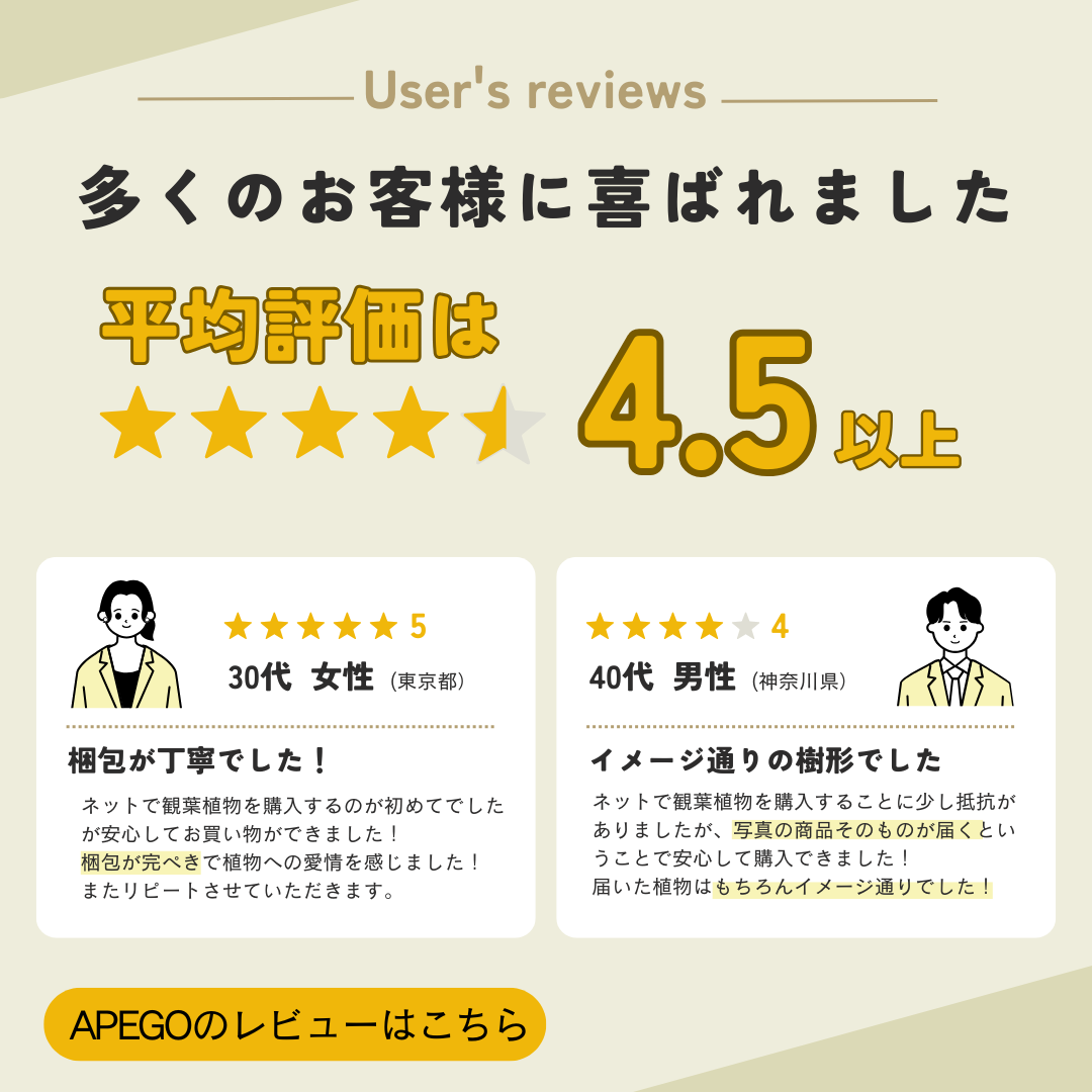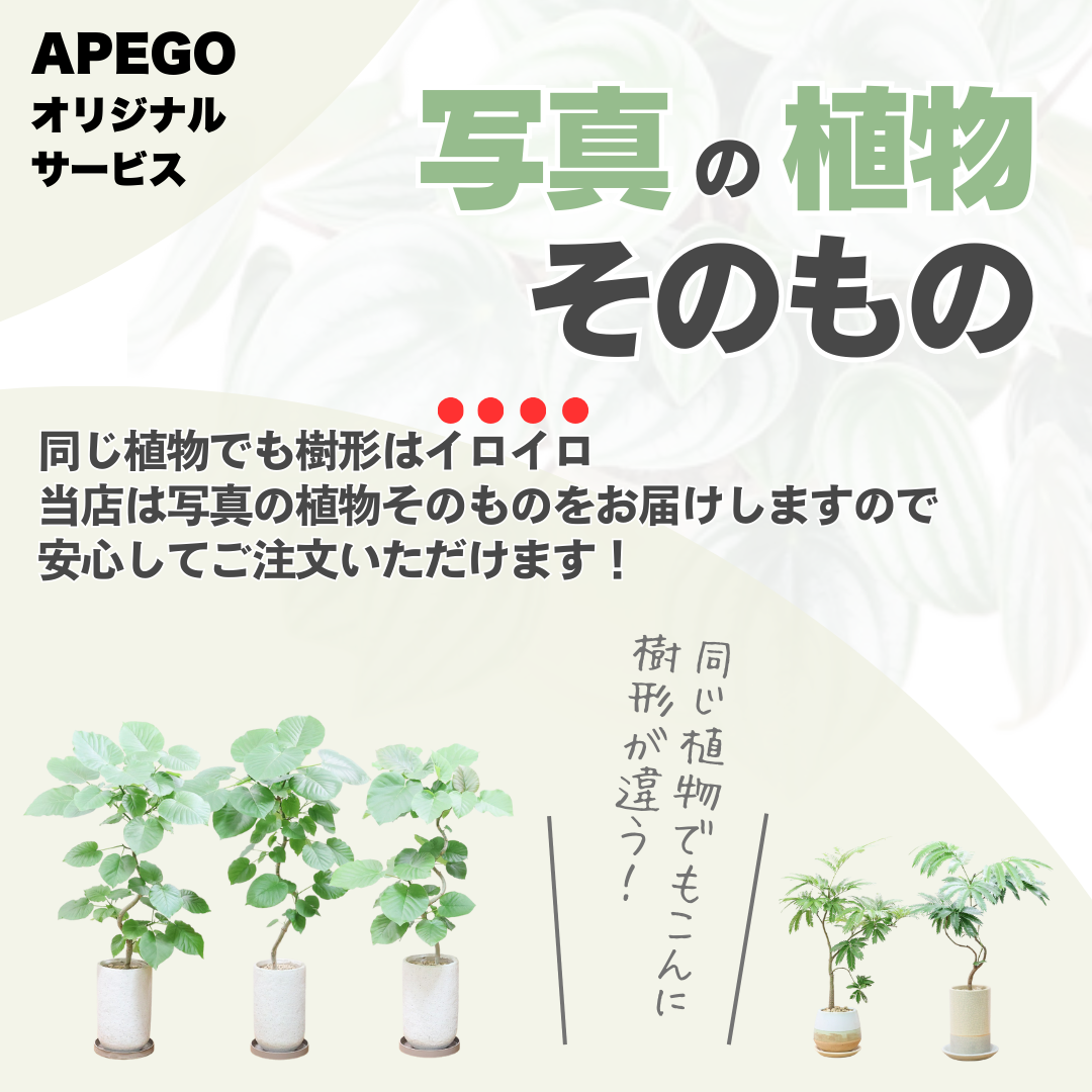 APEGOではお客様に安心して植物を選んでいただくため、植物を1つ1つ丁寧に撮影しております。安心してお気に入りの樹形の植物をお選びください。