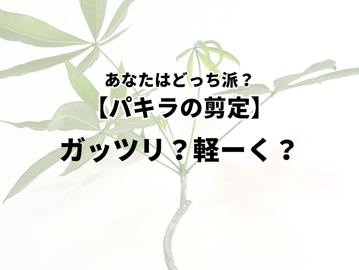 今回はパキラの剪定について解説していきます。パキラを剪定する場合、2種類の剪定方法があります。「ガッツリ剪定」と「軽ーく剪定」。ガッツリ剪定は枝を強めに剪定して芽数を増やしたい時に有効。逆に軽ーく剪定は今ある葉をすべてカットして葉をリセットする方法。
