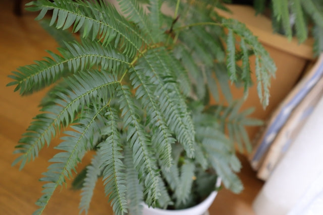 日本や東南アジアを中心に自生するエバーフレッシュは、日本でも身近な観葉植物の1つです。小さな葉っぱが何枚も連なって形成される植物の姿は、とてもキュート。また、夜になると葉っぱが閉じて眠ってしまう習性(就眠運動)があり、「まるで人間みたい!」と親近感を覚えるのも人気を集める秘密です。