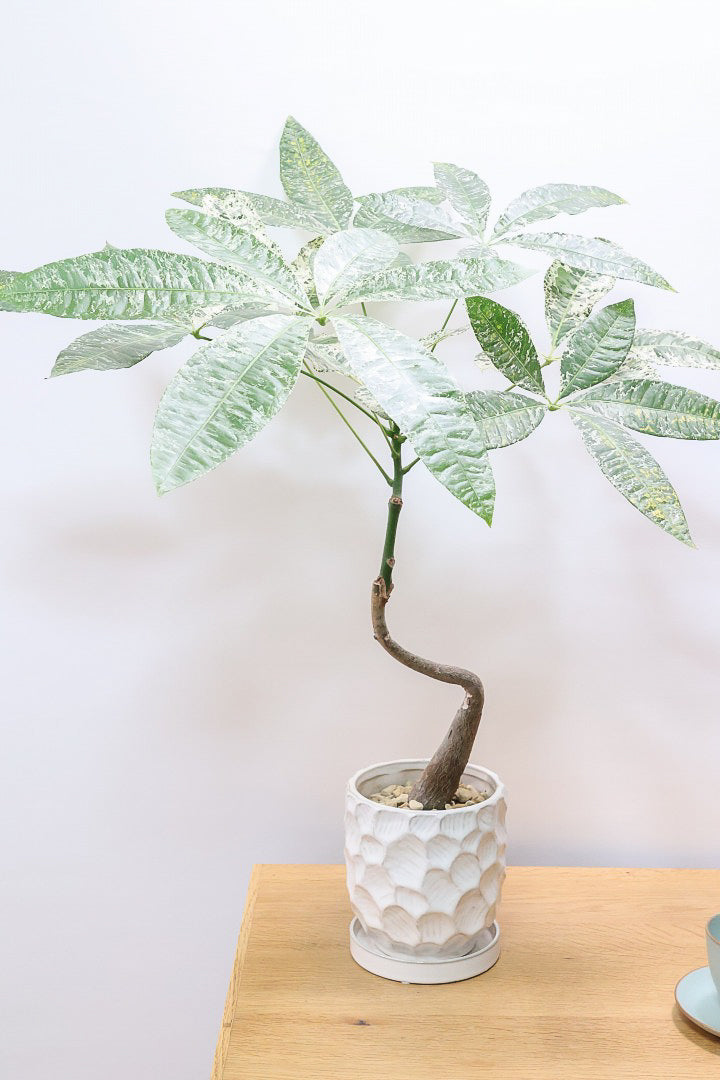 人気の観葉植物として知られるパキラ。その中でも、緑の葉に白い模様が入った斑入り(ふいり)のパキラは自生する数が少なく、希少な種類として知られています。
