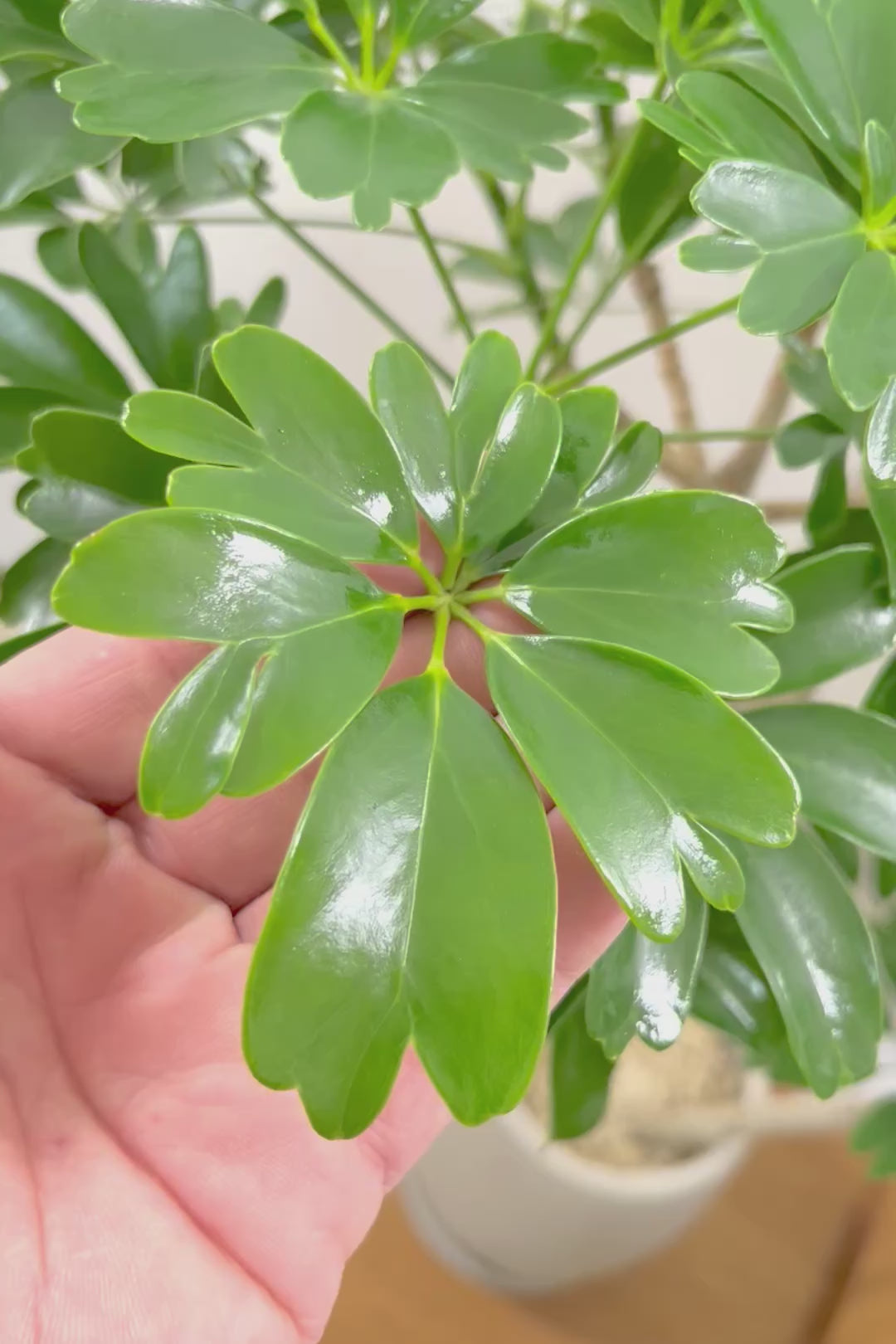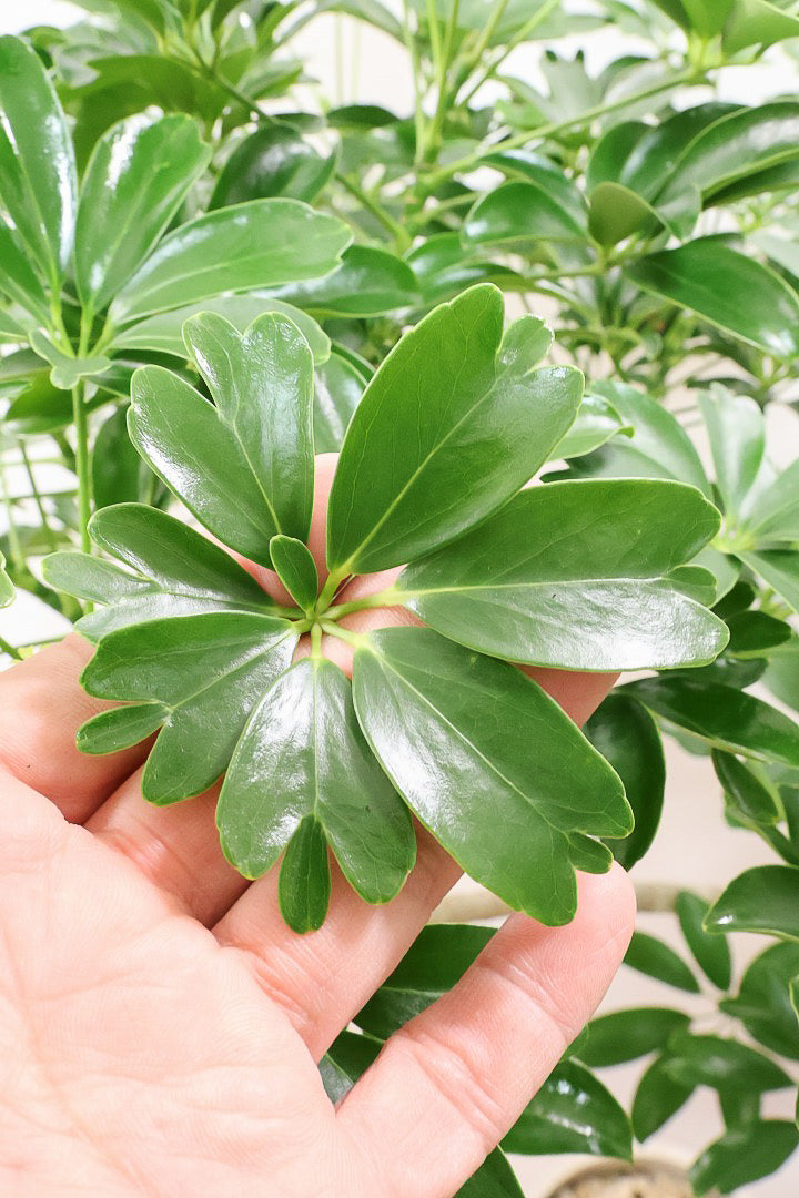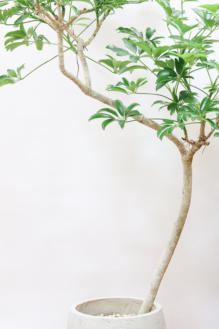 今回入荷のシェフレラは葉の先端が金魚の尾ひれのようになっているレナータという品種です!レナータはそのかわいい葉がかわいいと人気の品種です。性質はとても健常で丈夫。個性的な樹形のものが多く、お部屋のメイングリーンになる観葉植物です。長い時間けて生長する楽しみな植物です。