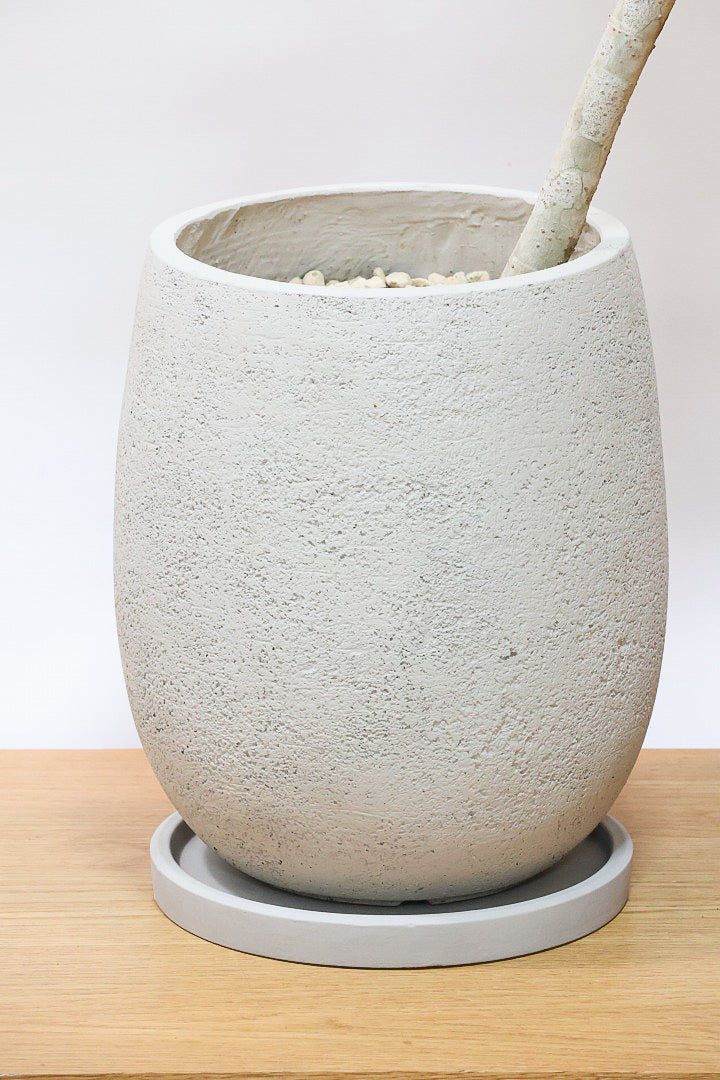 ファイバークレイ製の鉢です。こちらの商品の受け皿はプラスチック製となります。ファイバークレイとはガラス繊維から作られた耐久性に優れた素材です。