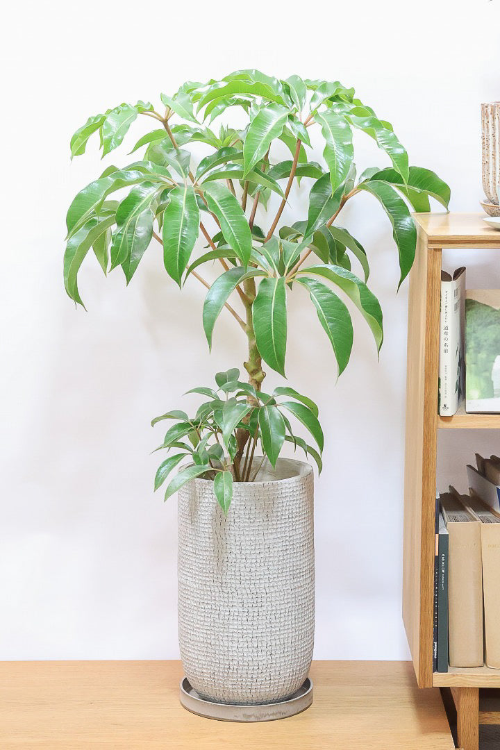 床置きタイプでテレビ台の横などのスペースで存在感を引き立てるサイズの観葉植物です。