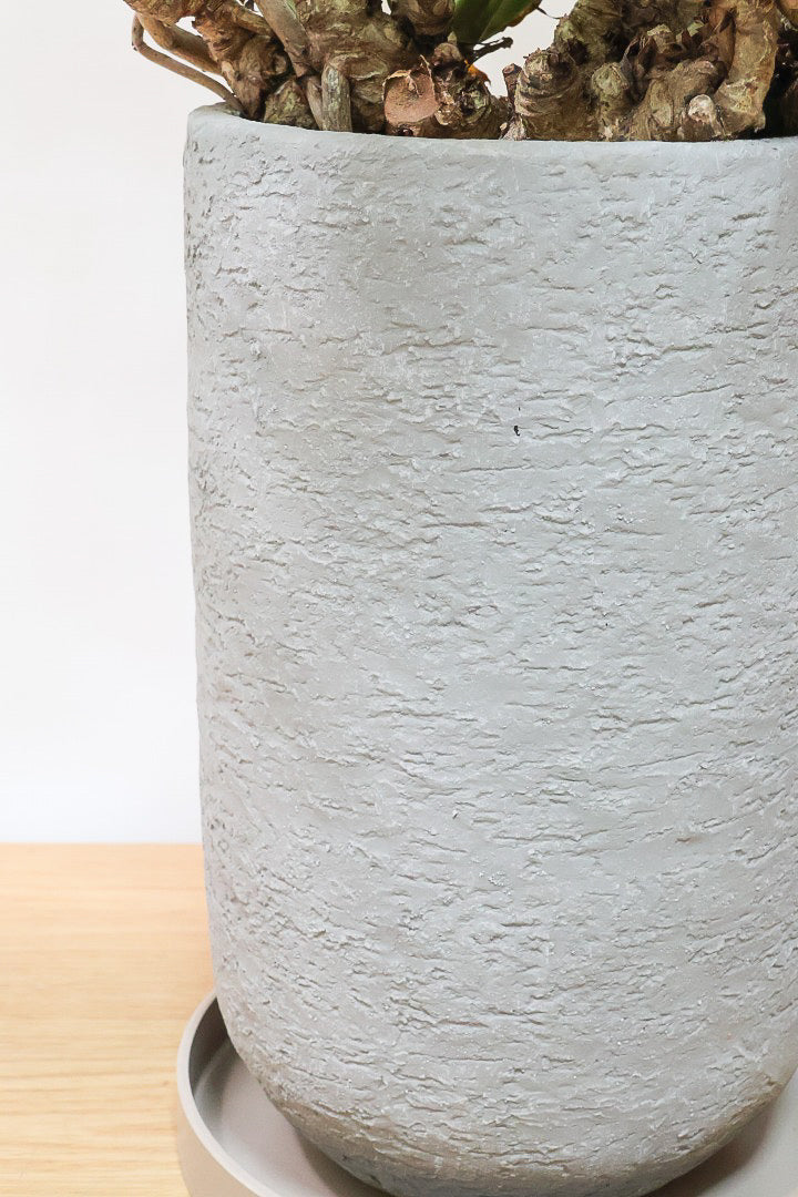 ファイバークレイ製の鉢です。こちらの商品の受け皿はプラスチック製となります。ファイバークレイとはガラス繊維から作られた耐久性に優れた素材です。