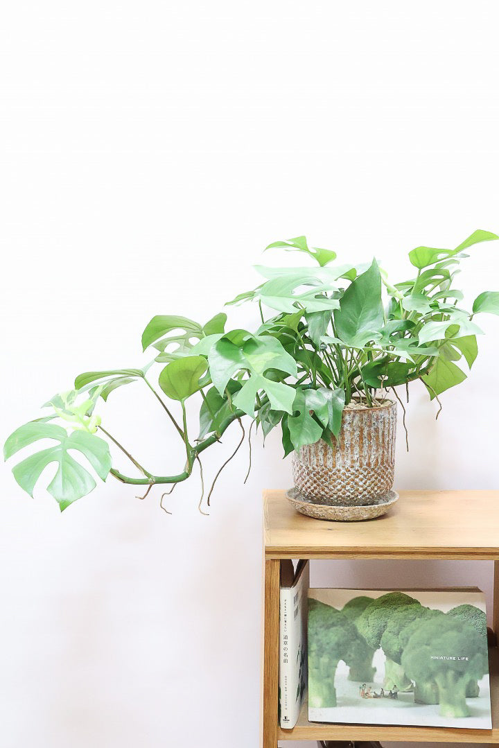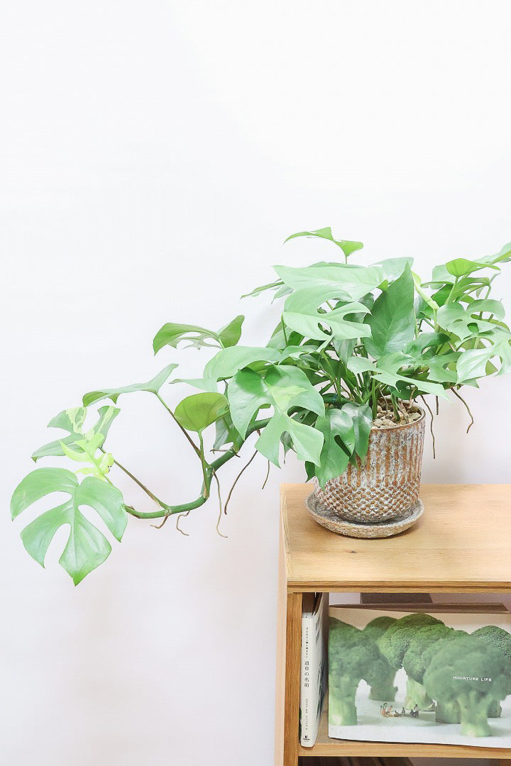 そんなかわいい葉の切れ込みが特徴のモンステラ ミニマ。性質はとても健常で育てやすい観葉植物です。1枚1枚が異なる切れ込みが入りますので、生長とともに表情を楽しむことのできる人気の観葉植物です。長い時間けて生長し、葉を伸ばしてナチュラルな樹形に変化していくので生長が楽しみな植物です。時間の流れとともにお部屋に馴染んでいく観葉植物です。