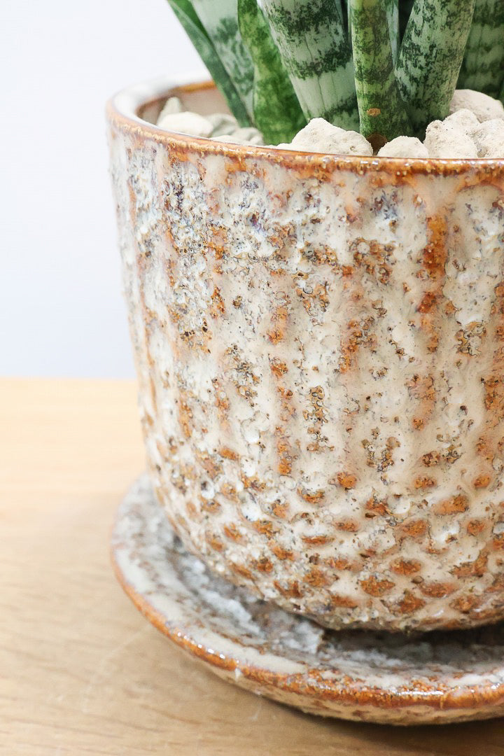 ゴツゴツした質感の陶器POTです。※自然の風合いを大切にするため、色ムラや歪み、欠けなどが多少あります。ご了承ください。
