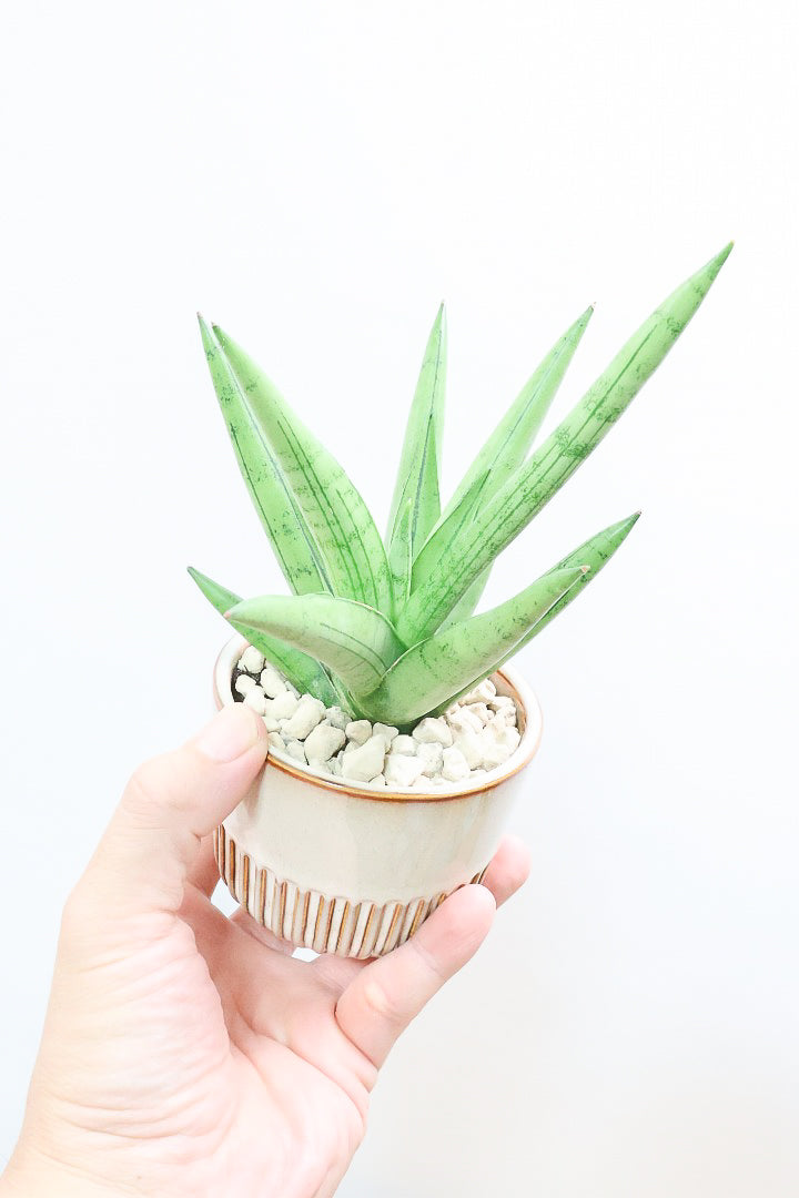 マイナスイオンを放出することで有名なサンスベリア♪葉の質感は多肉質でやや硬くとても丈夫です。新芽も出てくるので成長も楽しめます。生長すると小株がタケノコのようにニョキニョキ出てきて生長していきます。