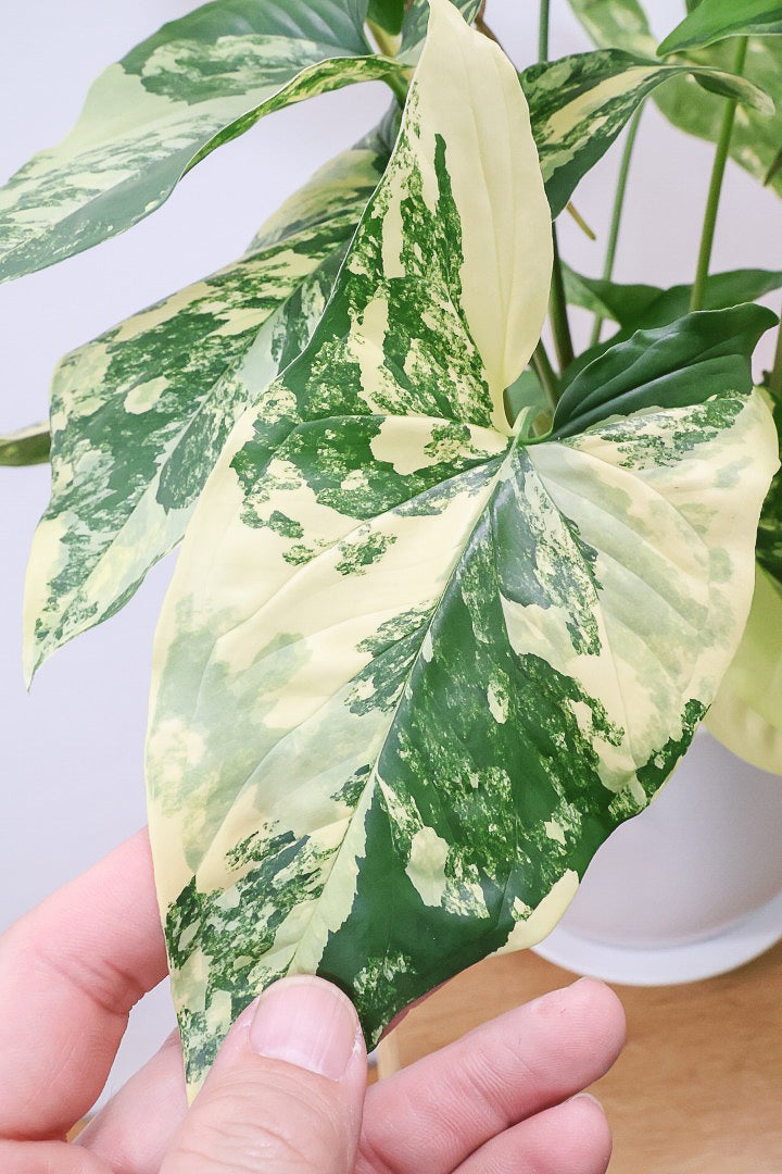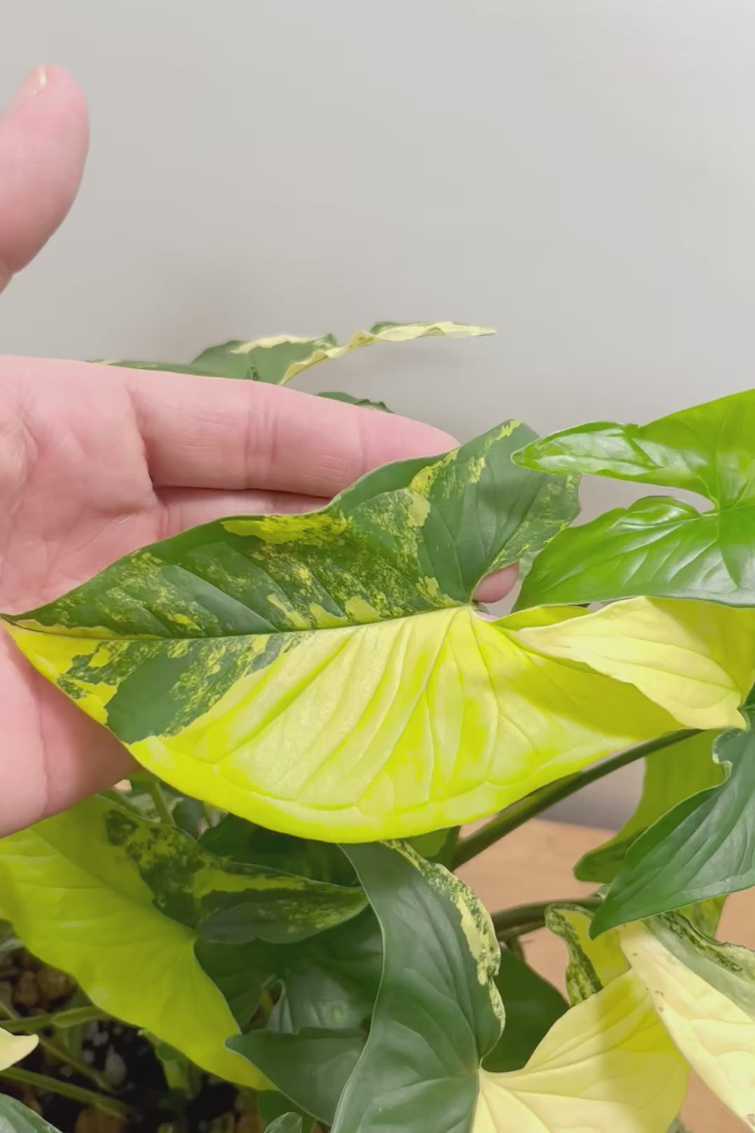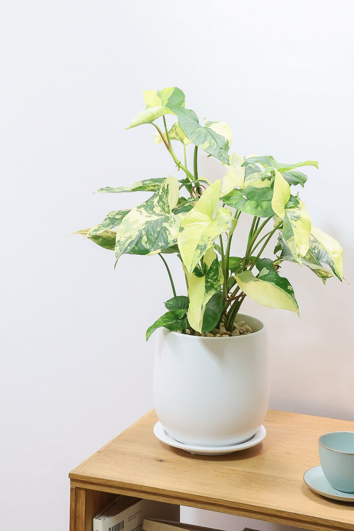 葉色が個性的で人気のシンゴニウム。性質はとても健常で育てやすい観葉植物です。1枚1枚が異なる表情の葉なので、生長とともに表情を楽しむことのできる人気の観葉植物です。長い時間けて生長し、葉を伸ばしてナチュラルな樹形に変化していくので生長が楽しみな植物です。時間の流れとともにお部屋に馴染んでいく観葉植物です。
