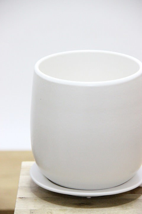 POTはマッドな質感のホワイトの陶器鉢。もちろん受け皿付きです!