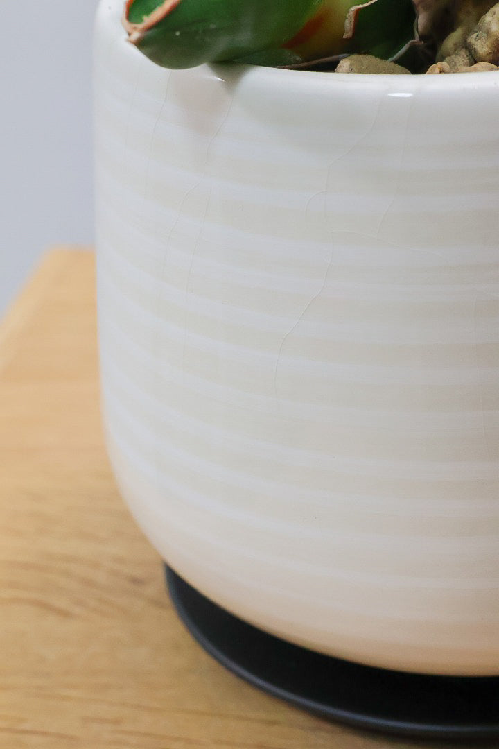 POTは光沢のある質感のホワイトの陶器鉢。もちろん受け皿付きです!!
