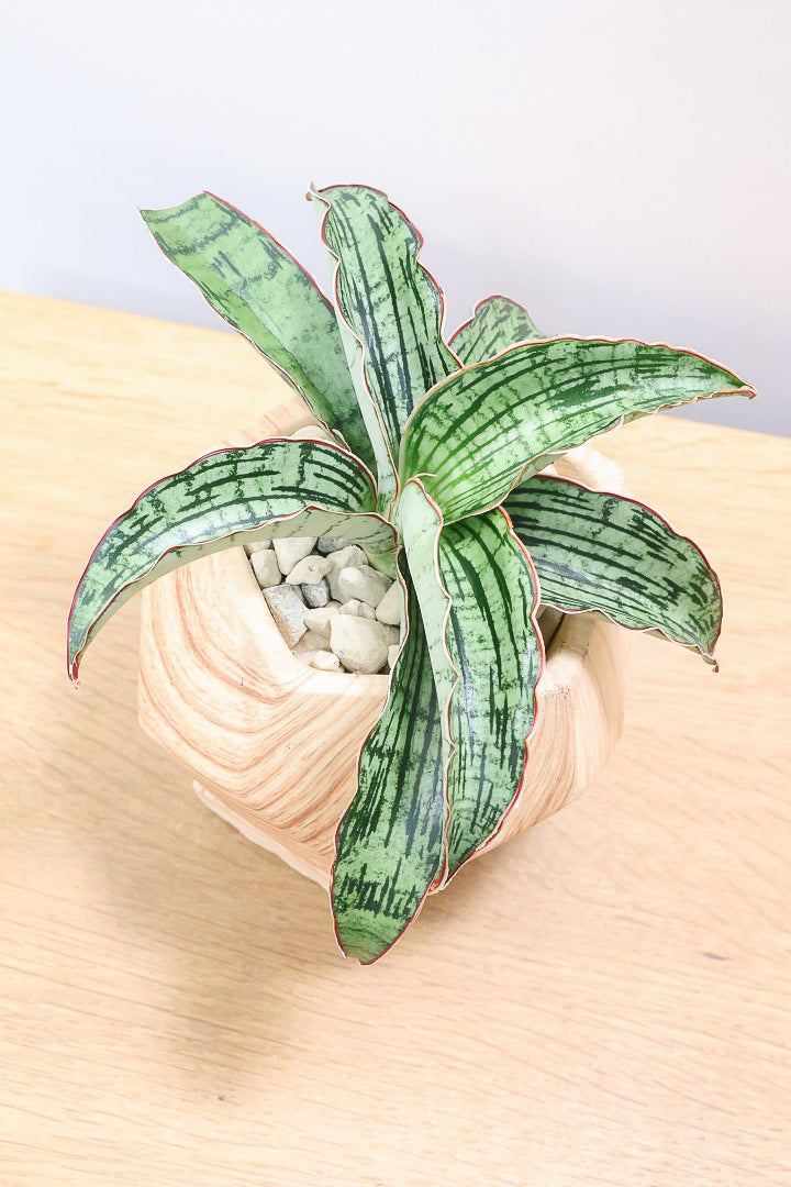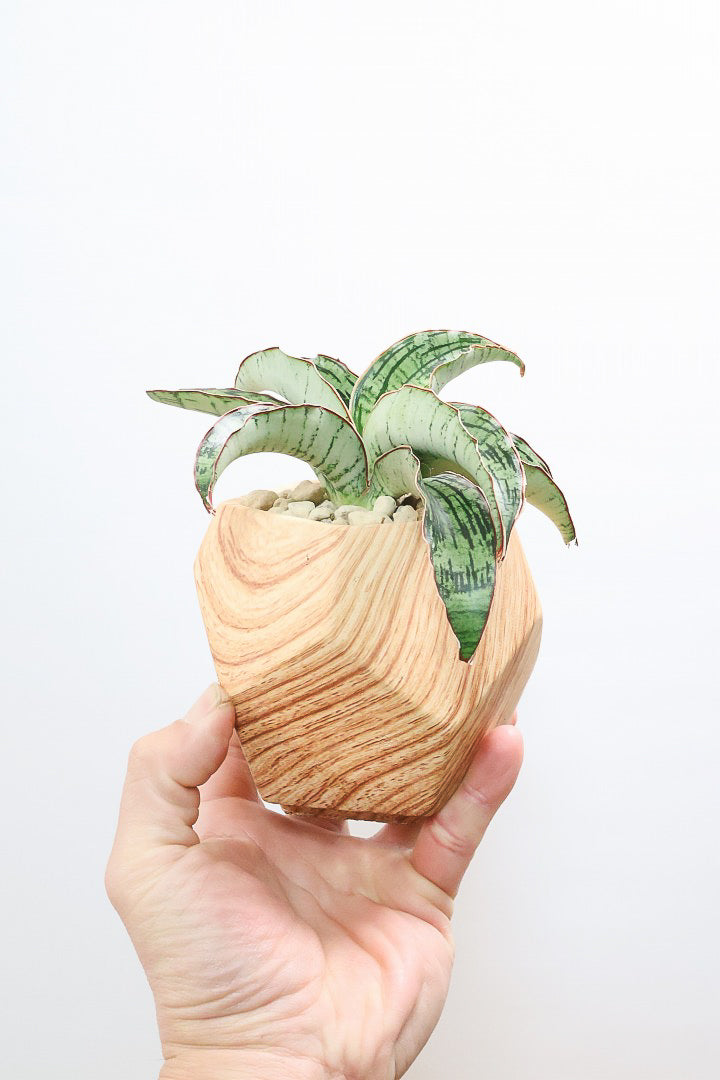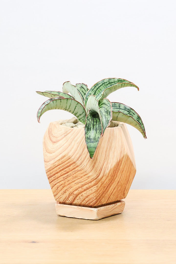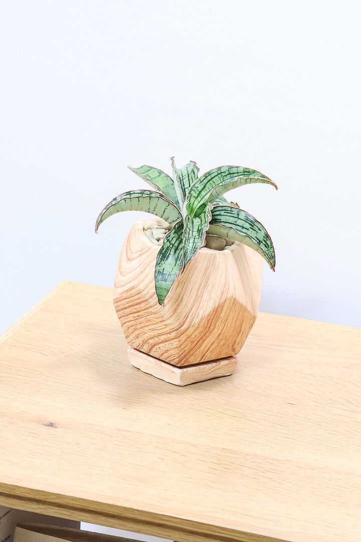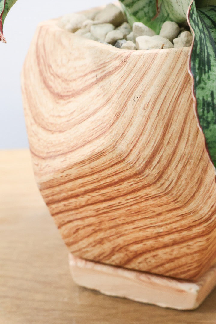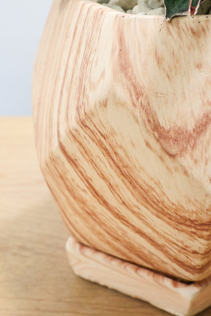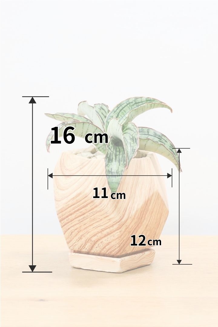 見た目は木製のように見えますが、実は木目調がプリントされた陶器鉢。植物をワンランク美しくランクアップさせてくれますね!