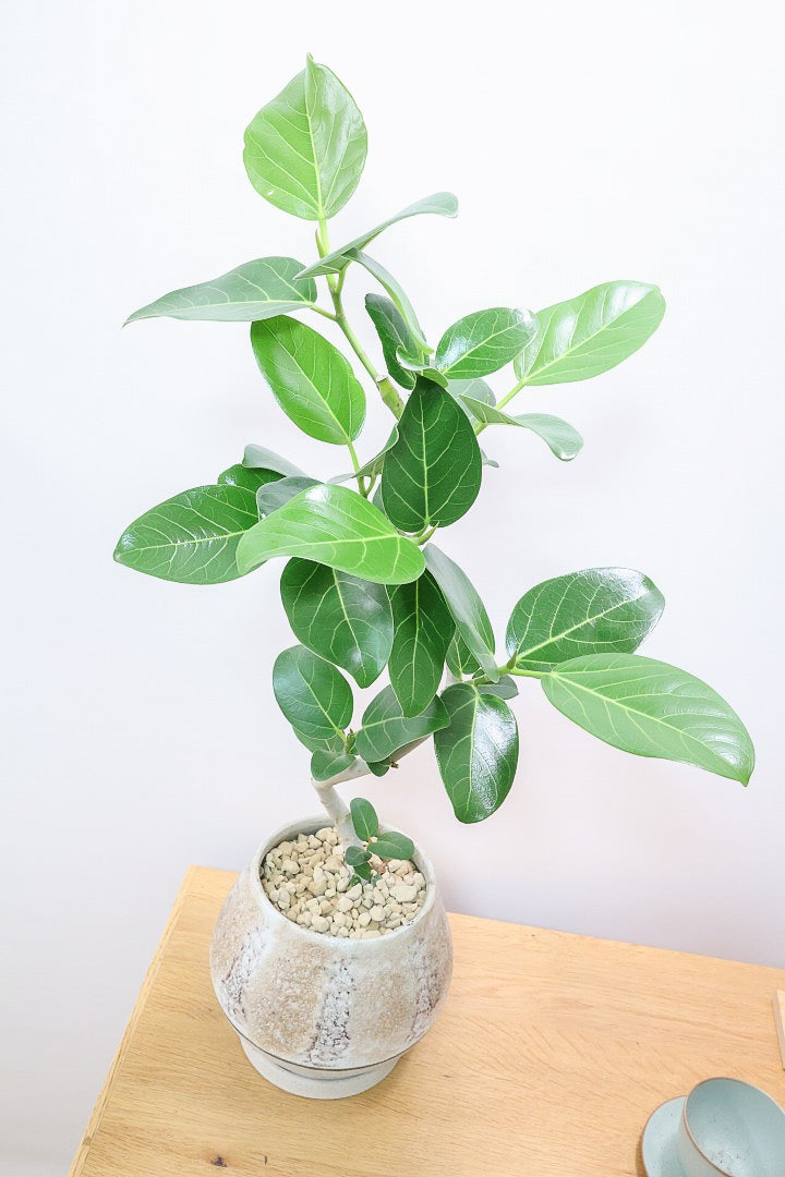 ゴムの木の仲間でとにかく丈夫で育てやすい!!葉っぱ一枚一枚がと大きいので存在感がとてもある植物です。葉の質感は肉厚でとてもしっかりとしています。長い時間をかけて成長する植物ですので、お部屋のインテリアとしてぴったりの植物です。