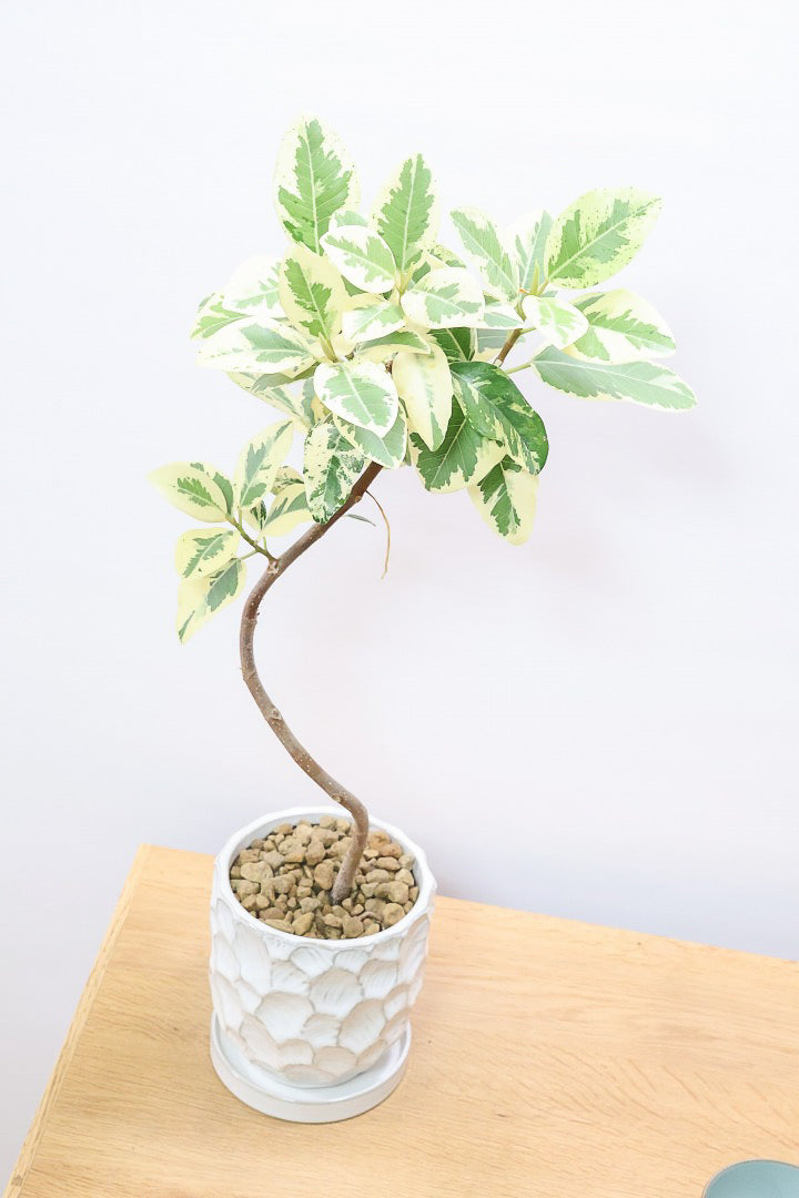 今回入荷のフランスゴムは希少な斑入りタイプ!しかも今回は希少な曲樹形!葉の模様は極上です!ぜひ手に取っていただきたい観葉植物です。