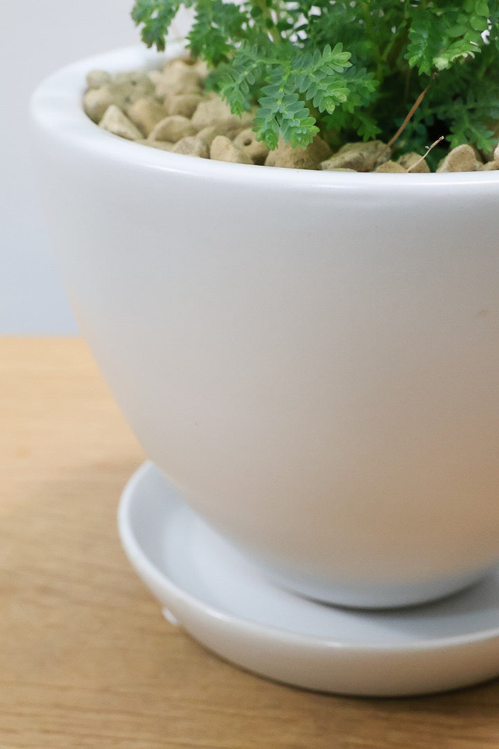 POTはマッドな質感のホワイトの陶器鉢。もちろん受け皿付きです!!