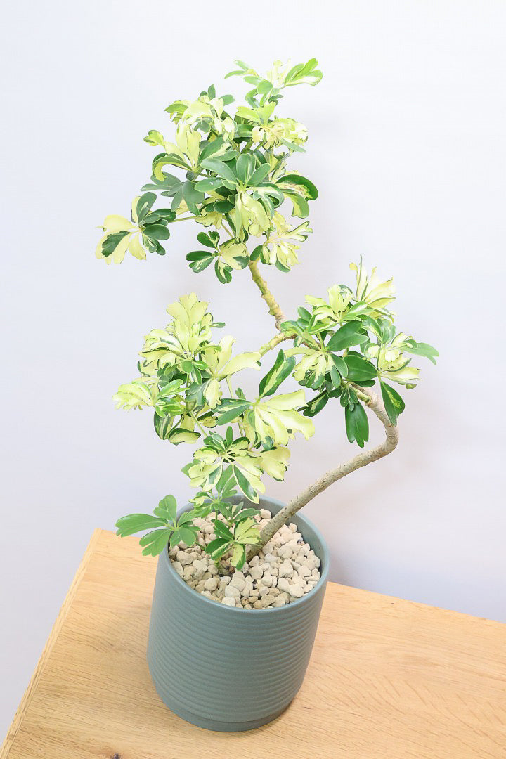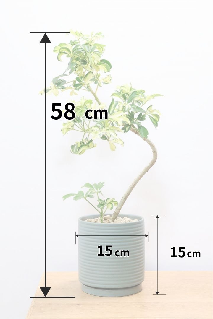 ジェニーネはその葉の鮮やかさから大人気のシェフレラ。シェフレラの中でも生長がゆっくりな品種ですのでここまでしっかりと作り込まれた樹形は希少です!