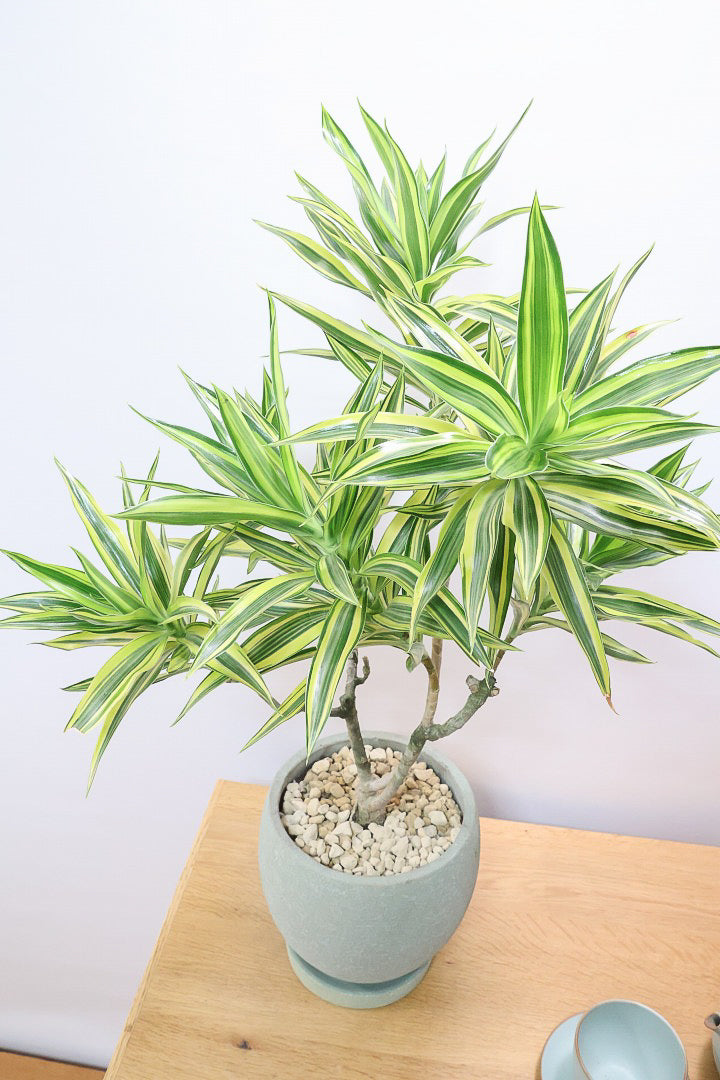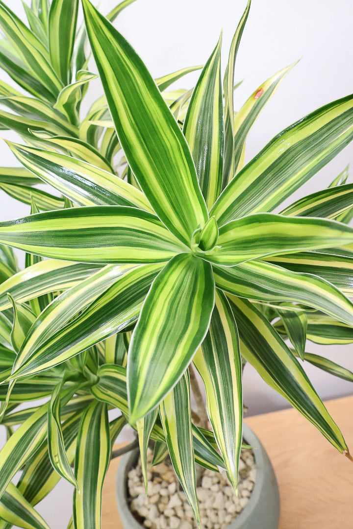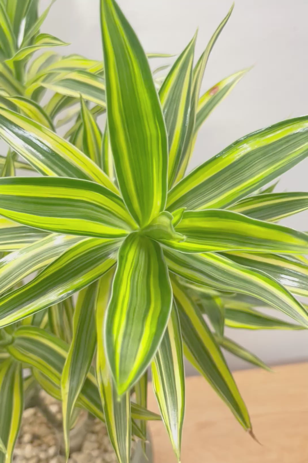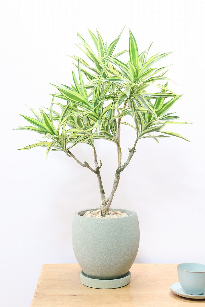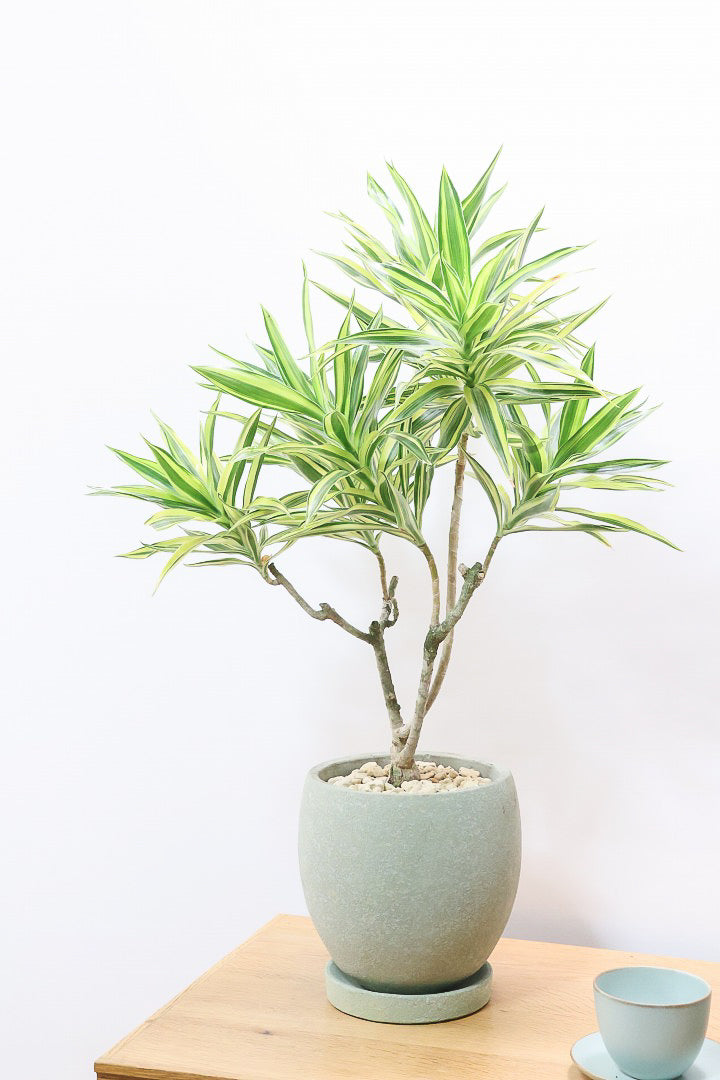 ドラセナはカラフルで鮮やかな葉が人気の観葉植物です。葉のトーンが明るいので贈り物にも大人気の観葉植物。とても育てやすいので会社の開業や移転、お店の開店祝いなどにも人気です。長い時間けて生長し、葉を伸ばしてナチュラルな樹形に変化していくので生長が楽しみな植物です。時間の流れとともにお部屋に馴染んでいく観葉植物です。