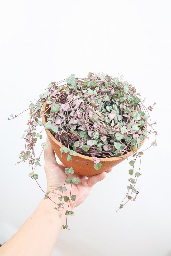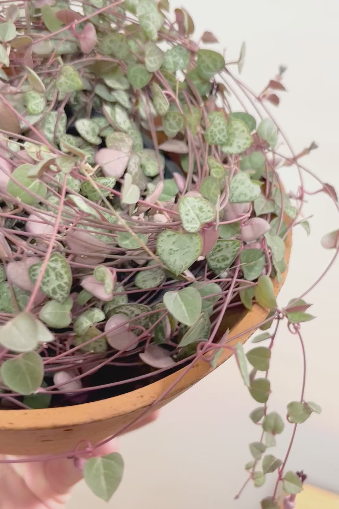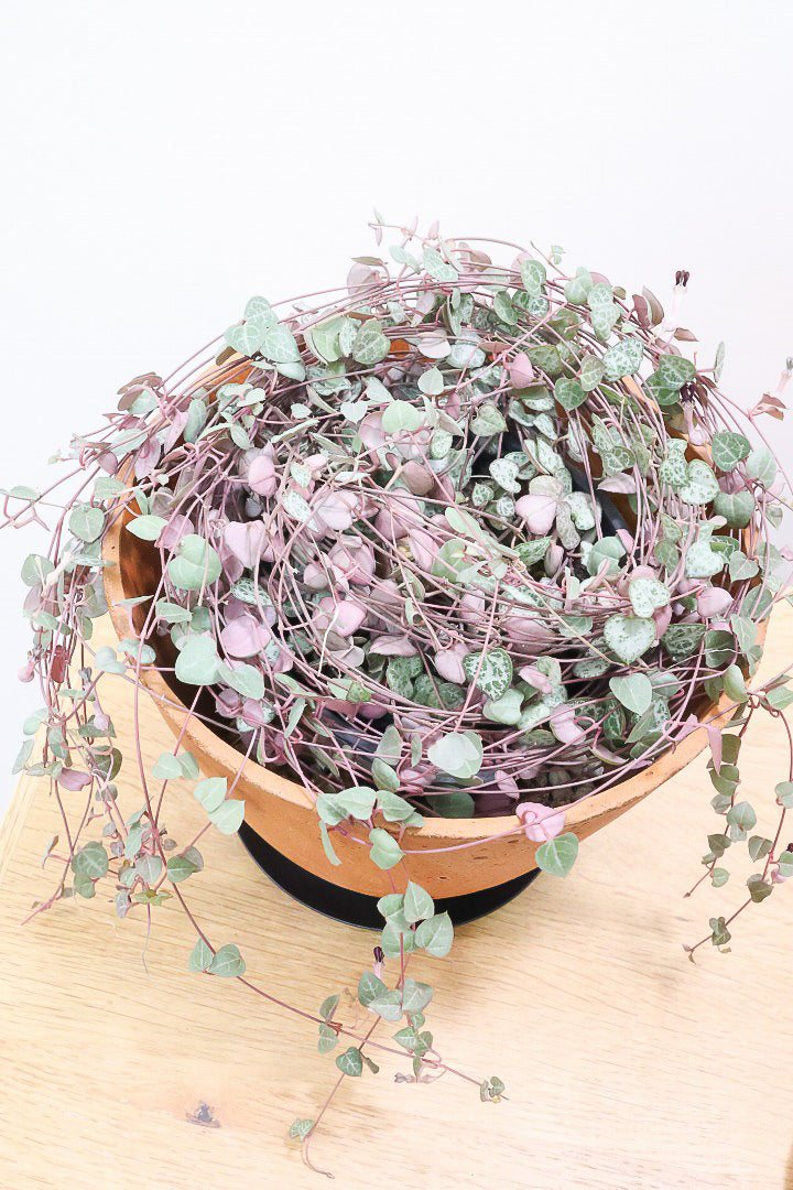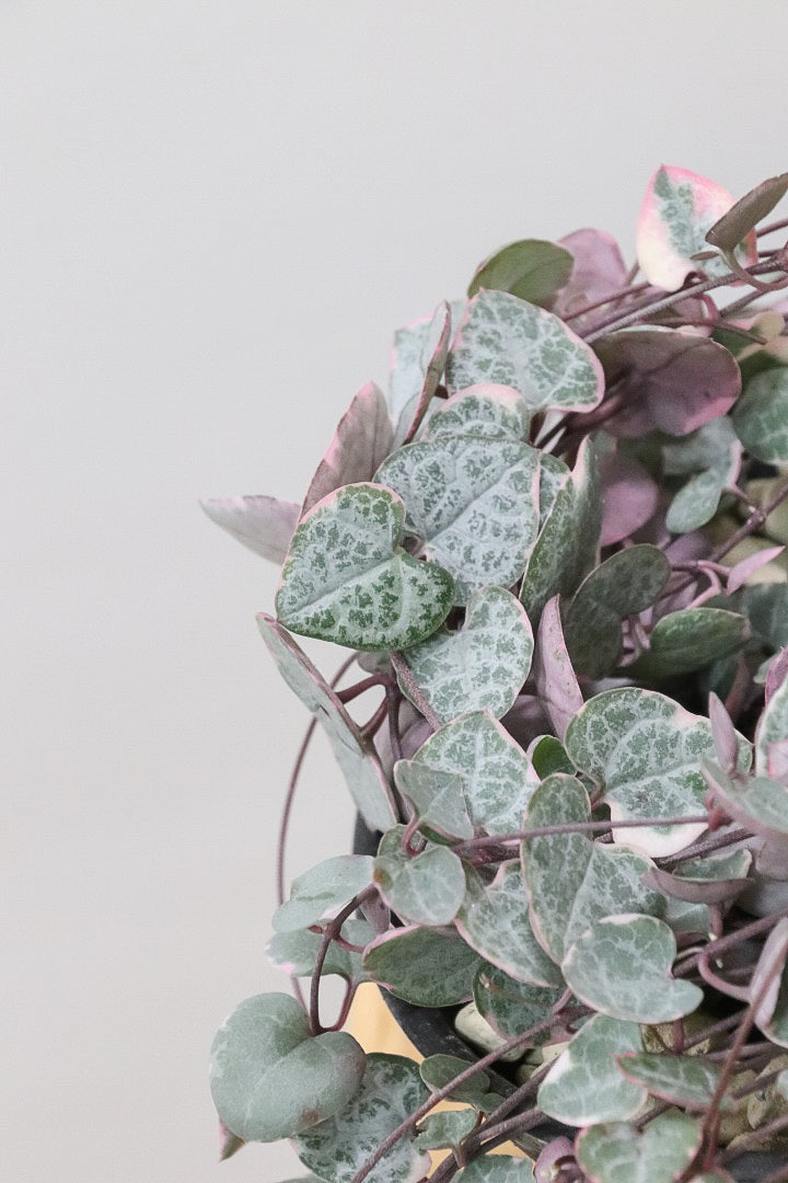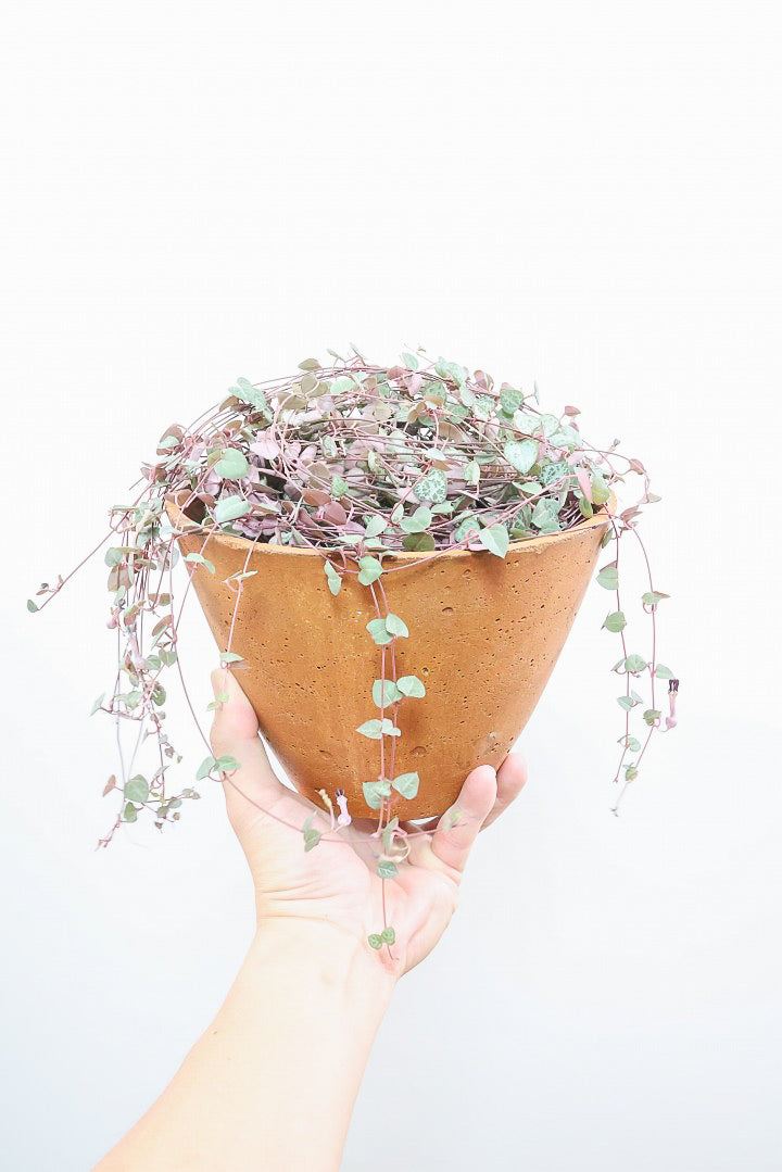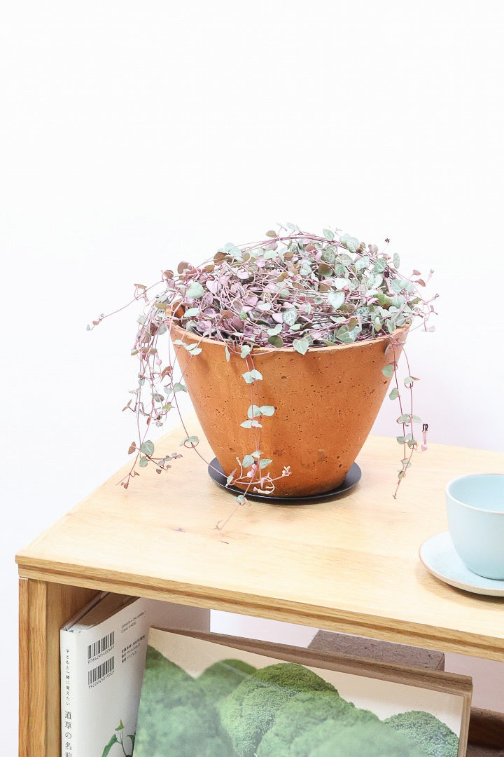 ハートの形の葉が人気のハートカズラ♪葉っぱが小さくとてもキュート♪新芽もかわいいハート型でとてもきれいです♪ツル状にどんどん新芽を出して生長しますので、成長の過程が楽しめるハートカズラ。お部屋のインテリアとしてぴったりの植物です。