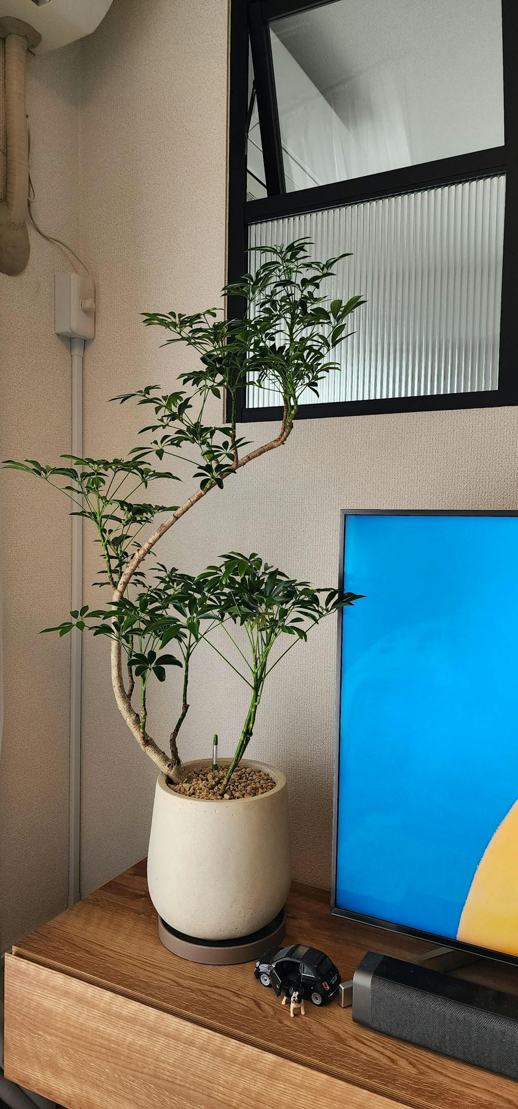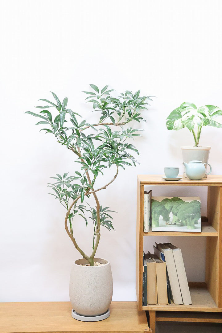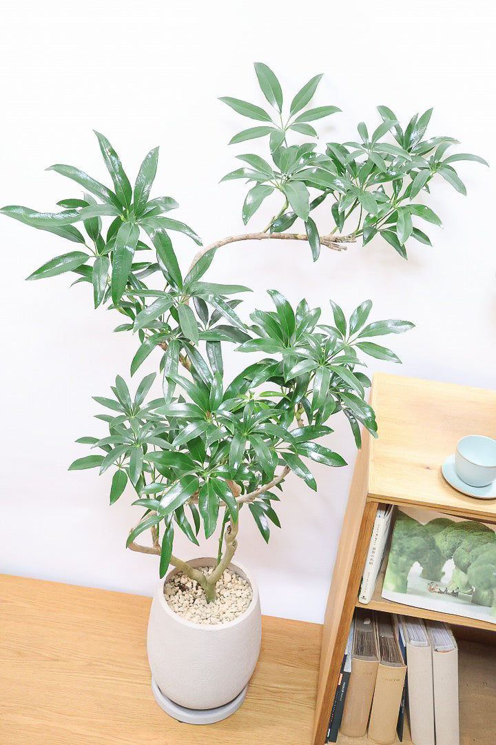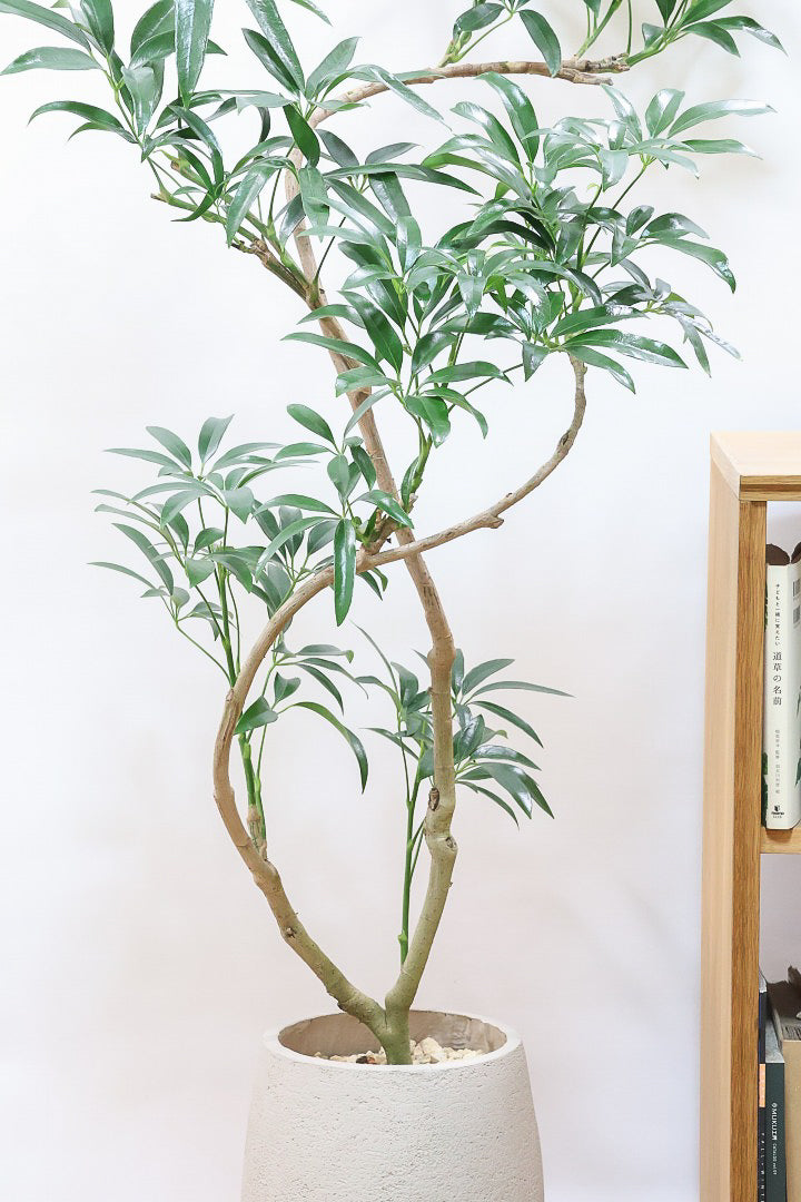 シェフレラはとにかく育てやすくて丈夫な観葉植物。性質はとても健常で丈夫。個性的な樹形のものが多く、お部屋のメイングリーンになる観葉植物です。長い時間けて生長し、葉を伸ばしていくので楽しみな植物です。