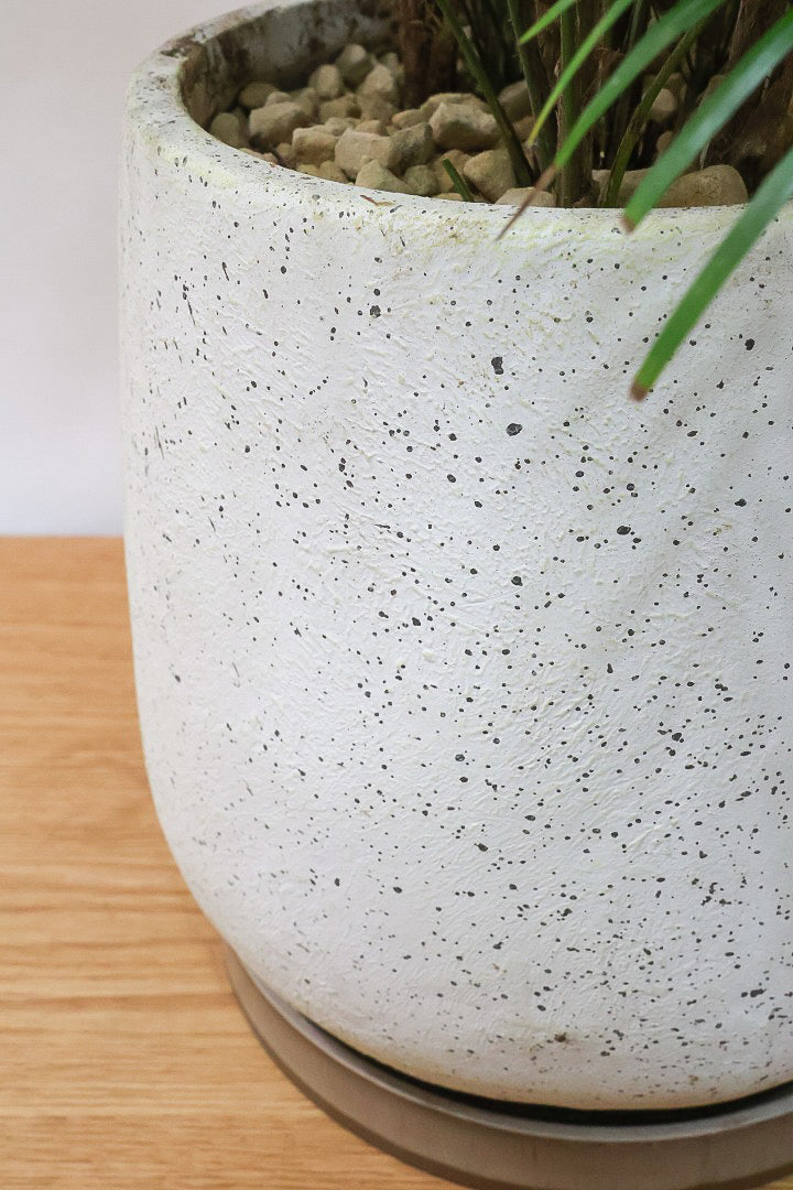 ファイバークレイ製の鉢です。こちらの商品の受け皿はプラスチック製となります。ファイバークレイとはガラス繊維から作られた耐久性に優れた素材です。