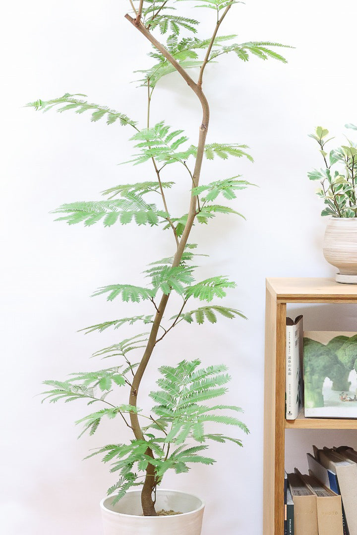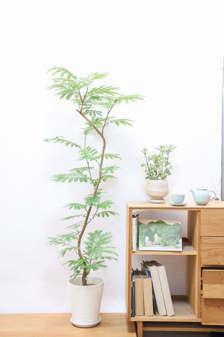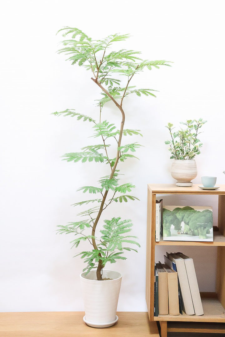 優しいふんわりとした葉が人気のエバーフレッシュ♪葉っぱが小さくとてもキュート♪夜になるとはがパタリと閉じますので、明るい時と暗い時で異なった表情が楽しめる人気の観葉植物です。長い時間をかけて生長し、枝を伸ばしてナチュラルな樹形に変化していくので生長が楽しみな植物です。お部屋のインテリアとしてぴったりの植物です。