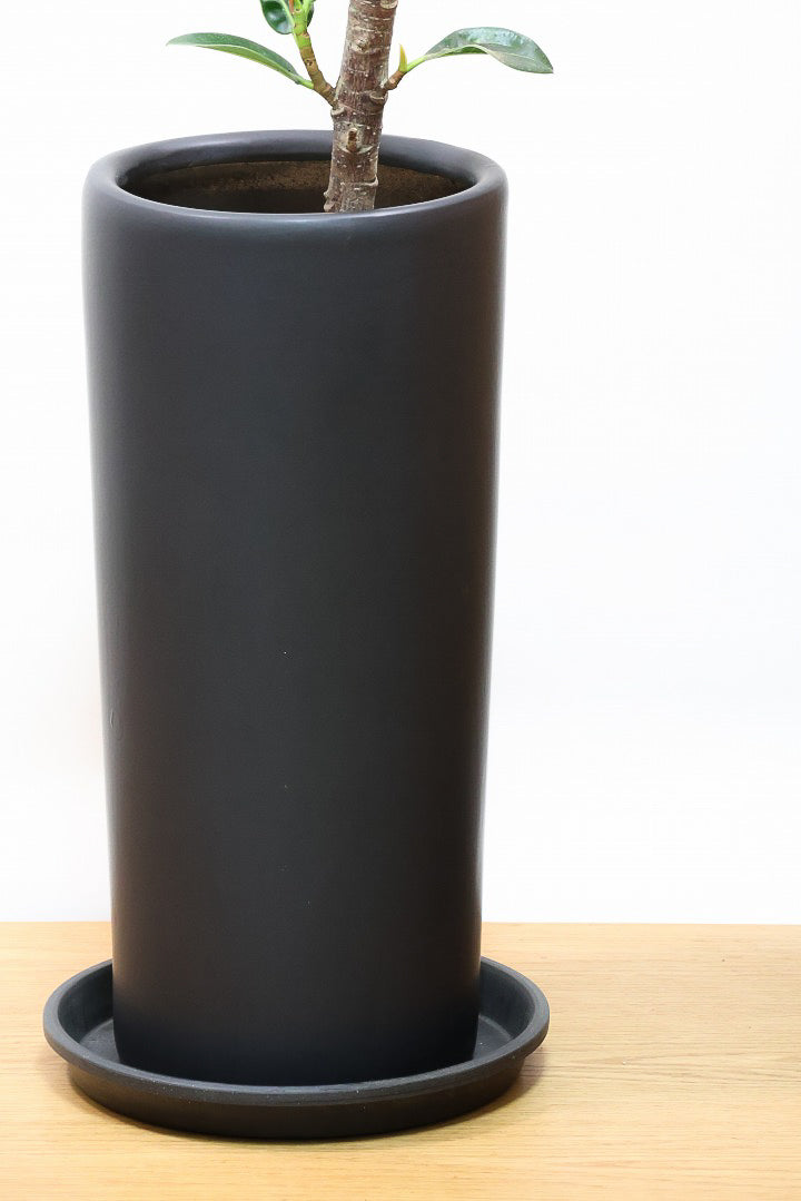 POTはマッドな質感のブラックの陶器鉢。もちろん受け皿付きです!!