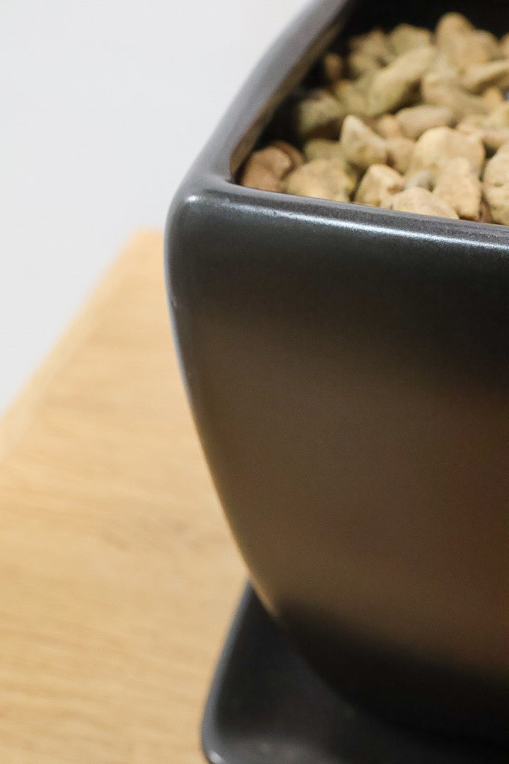 POTはマッドな質感のブラックの陶器鉢。もちろん受け皿付きです!!