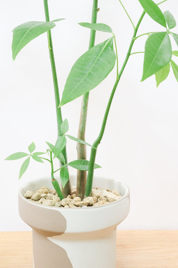 パキラは他の植物に比べ幹がとても個性的で独特な雰囲気を持っています。新芽はとても小さくてかわいいので成長が楽しめる観葉植物です。きれいな新芽を出すためには日がよく当たる場所に置き、肥料もしっかりあげること!!