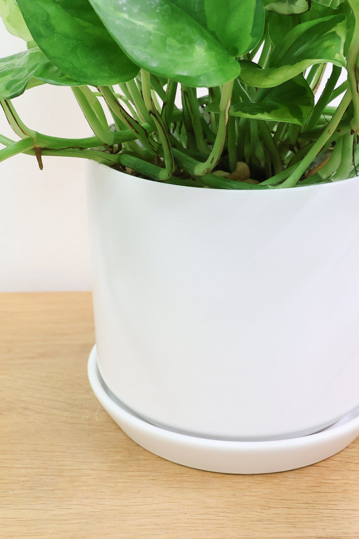 POTはマッドな質感のホワイトの陶器鉢。もちろん受け皿付きです!!