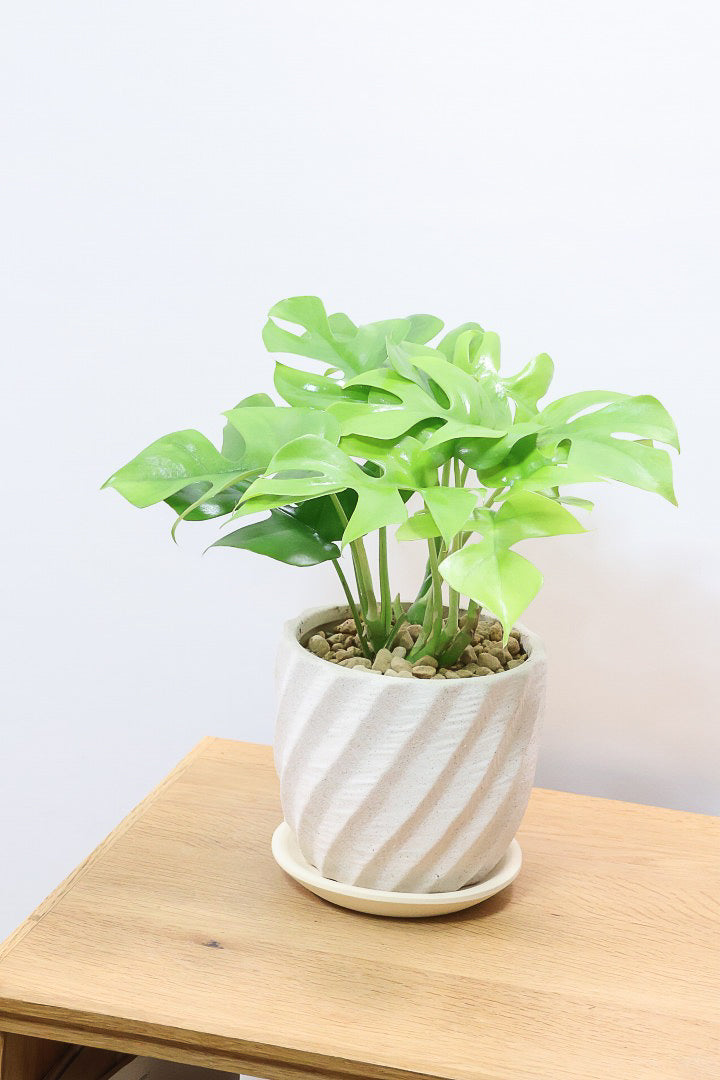 かわいい葉の切れ込みが特徴のモンステラ ミニマ。性質はとても健常で育てやすい観葉植物です。1枚1枚が異なる切れ込みが入りますので、生長とともに表情を楽しむことのできる人気の観葉植物です。長い時間けて生長し、葉を伸ばしてナチュラルな樹形に変化していくので生長が楽しみな植物です。時間の流れとともにお部屋に馴染んでいく観葉植物です。