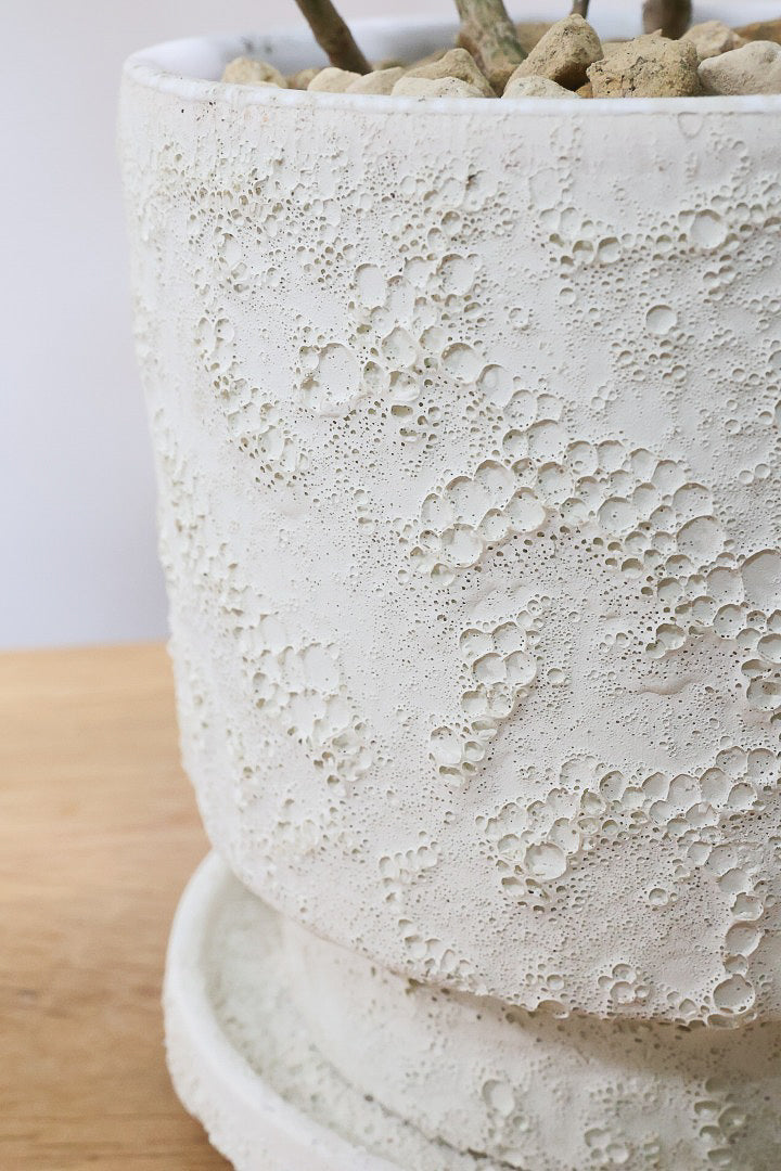ゴツゴツした質感の陶器POTです。※自然の風合いを大切にするため、色ムラや歪み、欠けなどが多少あります。また発泡系の釉薬を使用していますので、表面の釉薬がパラパラすることがありますのでご了承ください。