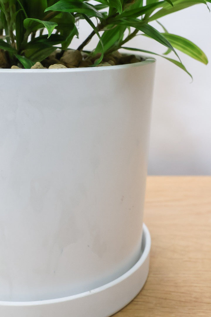 POTはマッドな質感の濃淡のあるホワイトの陶器鉢。もちろん受け皿付きです!!