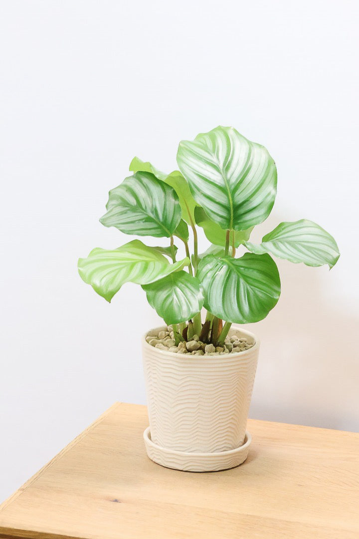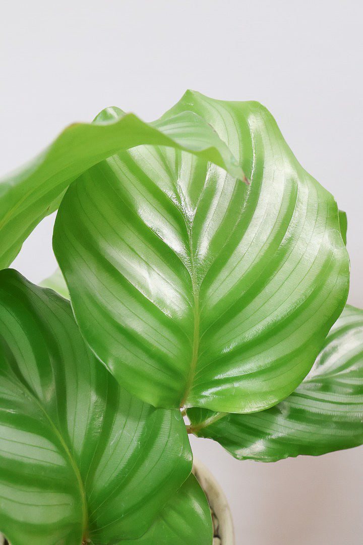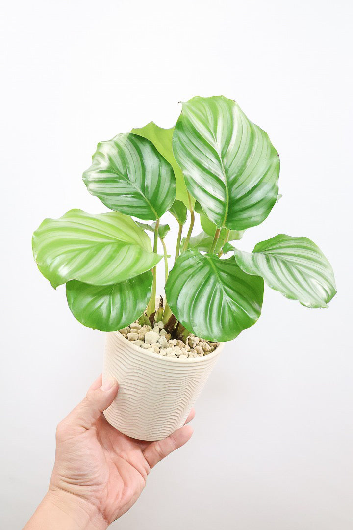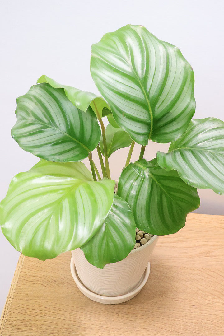 カラテアは葉の模様がとても美しく人気の観葉植物です。存在感があるので人気の観葉植物。会社の開業や移転、お店の開店祝いなどにも人気です。葉はそれぞれ模様が異なるので新芽がでるたびに生長が楽しみな植物です。時間の流れとともにお部屋に馴染んでいく観葉植物です。