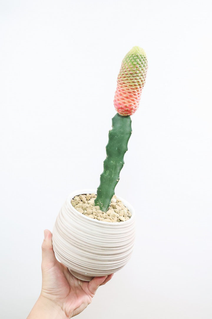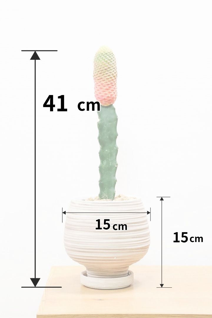 今回入荷のスルコレブチアはサボテンの仲間です。接木と言って異なる植物の台木に接ぎ木をしたタイプ。接ぎ木タイプの方が水の管理もしやすく丈夫に生長しますので、初めてサボテンを育てる方にも安心です。