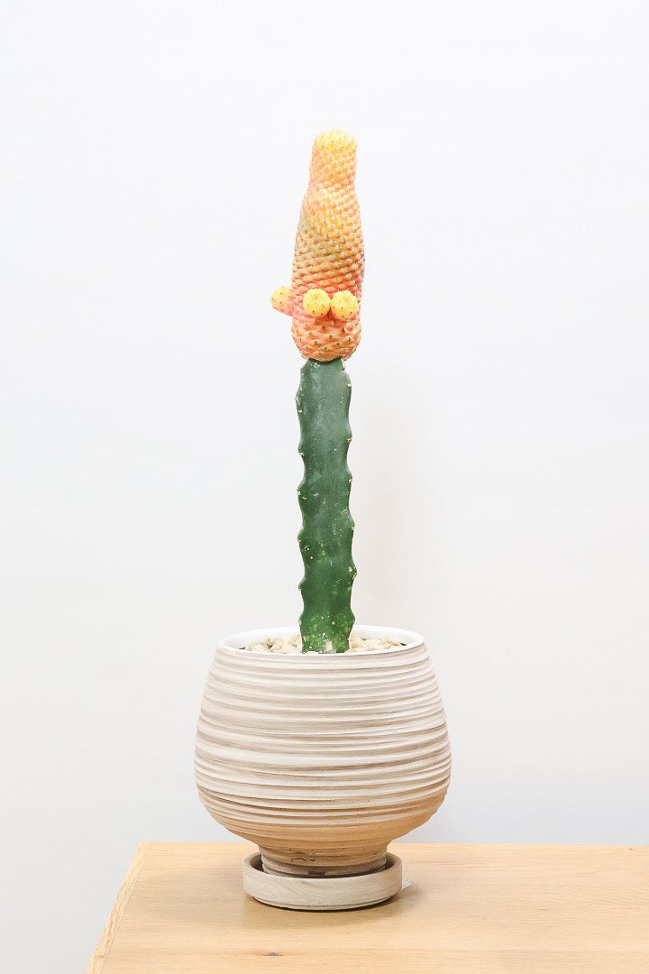 今回入荷のスルコレブチアはサボテンの仲間です。接木と言って異なる植物の台木に接ぎ木をしたタイプ。接ぎ木タイプの方が水の管理もしやすく丈夫に生長しますので、初めてサボテンを育てる方にも安心です。