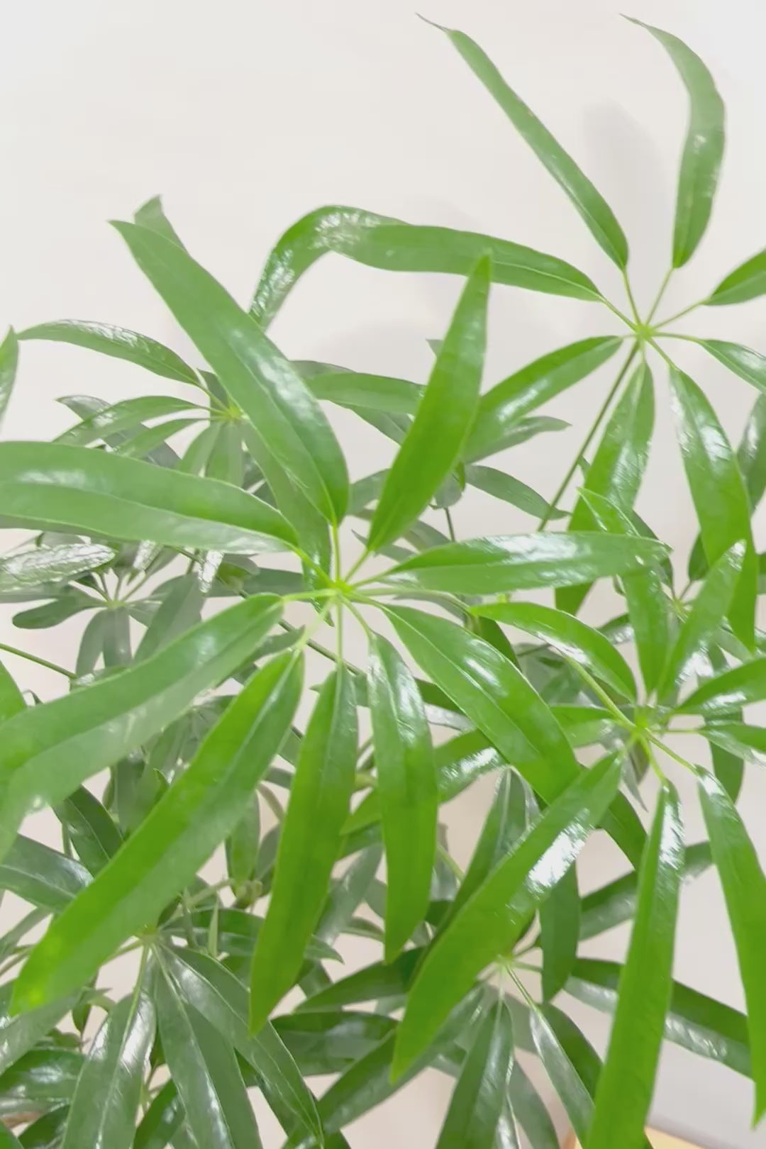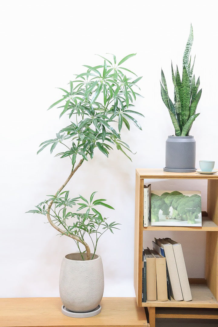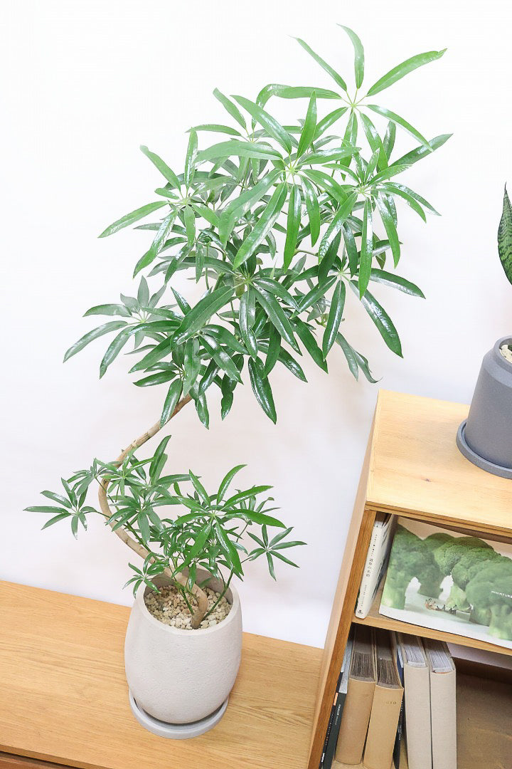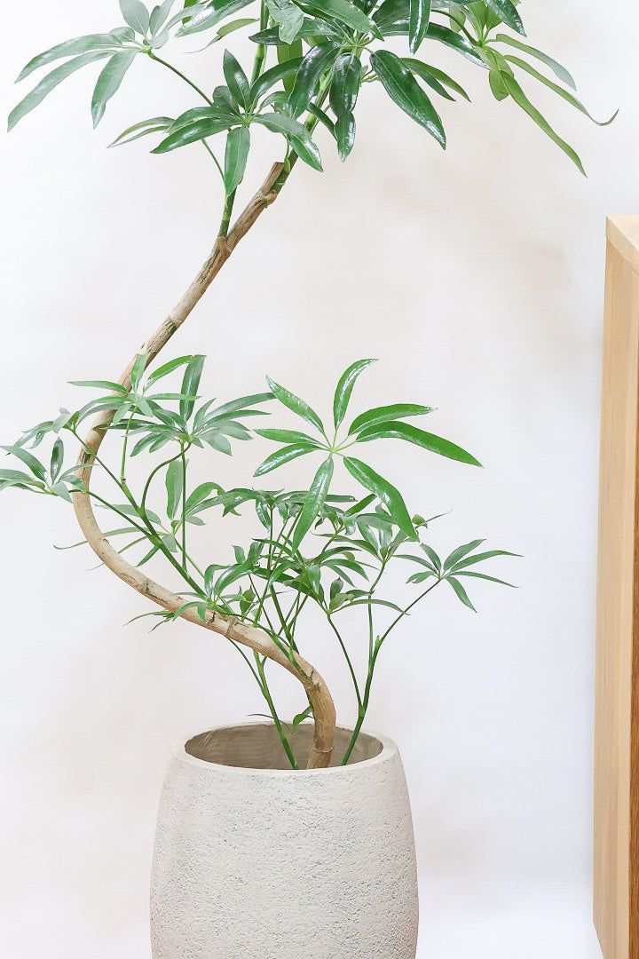 シェフレラはとにかく育てやすくて丈夫な観葉植物。性質はとても健常で丈夫。個性的な樹形のものが多く、お部屋のメイングリーンになる観葉植物です。長い時間けて生長し、葉を伸ばしていくので楽しみな植物です。