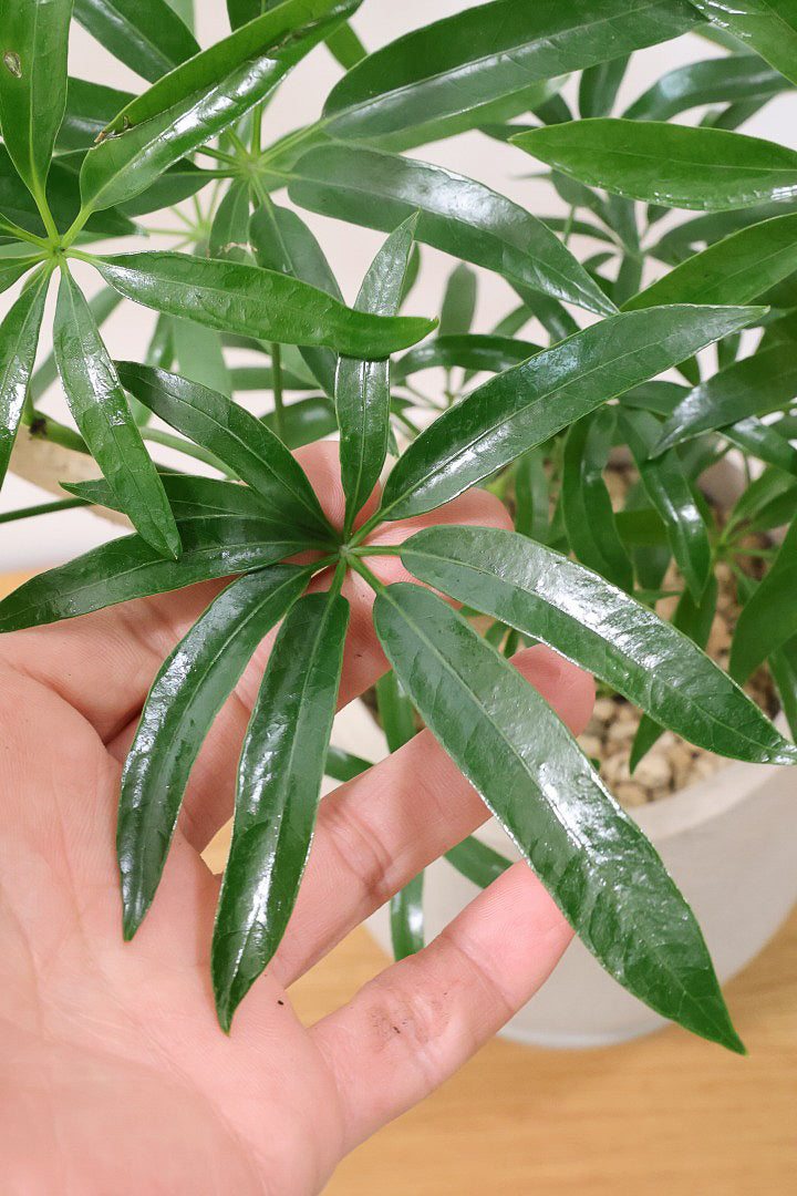 今回入荷のアンガスティフォリアはシャープな葉がとても美しいシェフレラです。幹のカーブもとても美しく仕上げられていますので、オススメです!