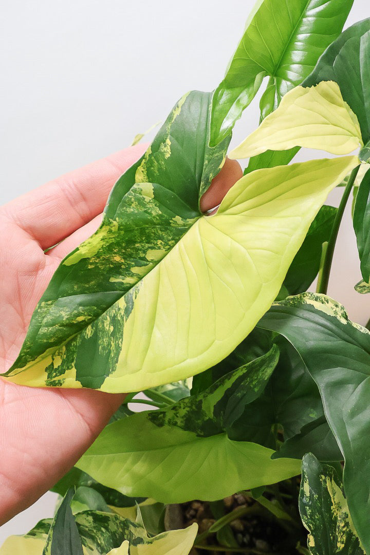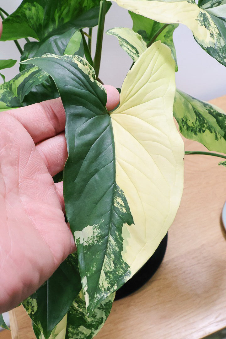 葉色が個性的で人気のシンゴニウム。性質はとても健常で育てやすい観葉植物です。1枚1枚が異なる表情の葉なので、生長とともに表情を楽しむことのできる人気の観葉植物です。長い時間けて生長し、葉を伸ばしてナチュラルな樹形に変化していくので生長が楽しみな植物です。時間の流れとともにお部屋に馴染んでいく観葉植物です。