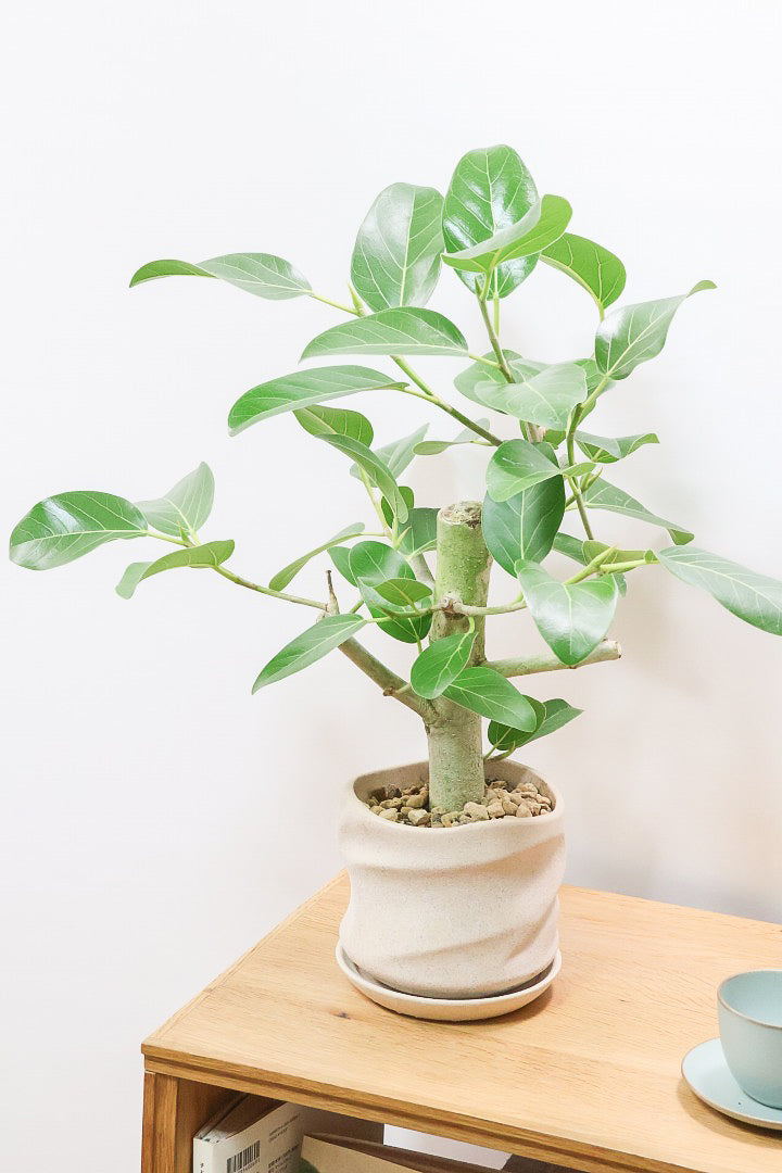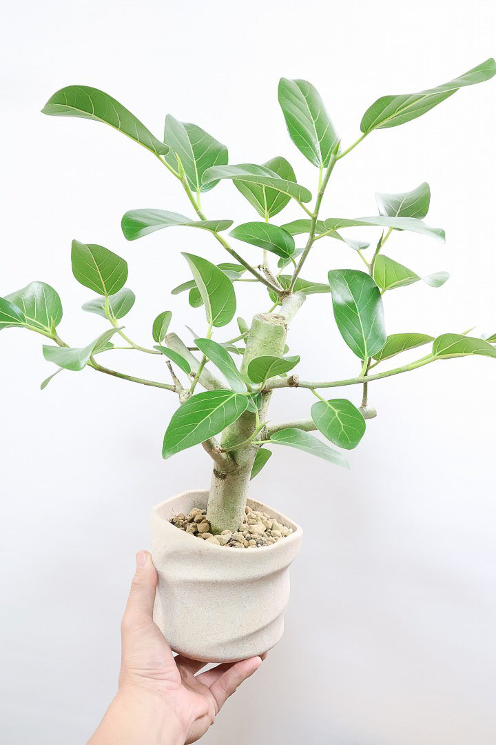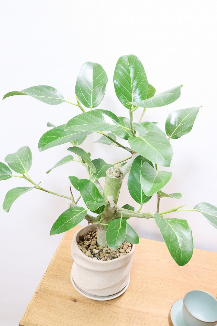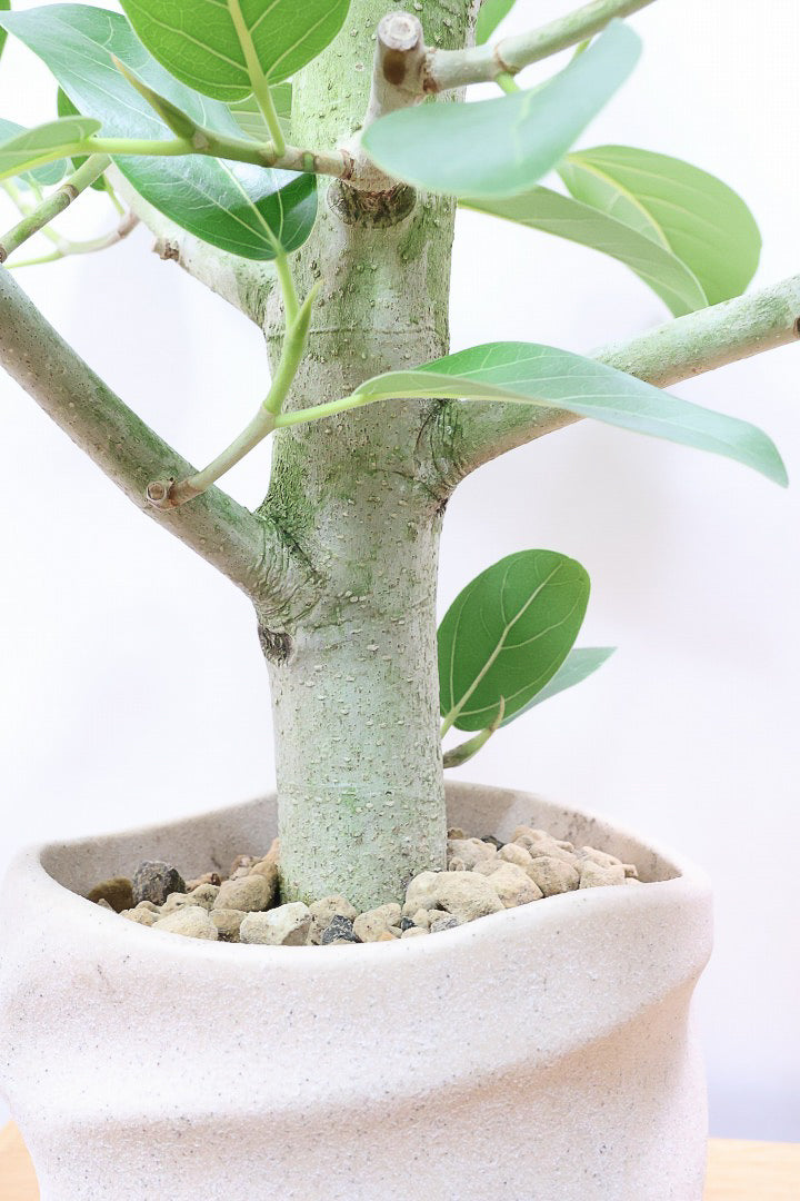 ゴムの木の仲間でとにかく丈夫で育てやすい!!葉っぱ一枚一枚がと大きいので存在感がとてもある植物です。葉の質感は肉厚でとてもしっかりとしています。長い時間をかけて生長する植物ですので、お部屋のインテリアとしてぴったりの植物です。