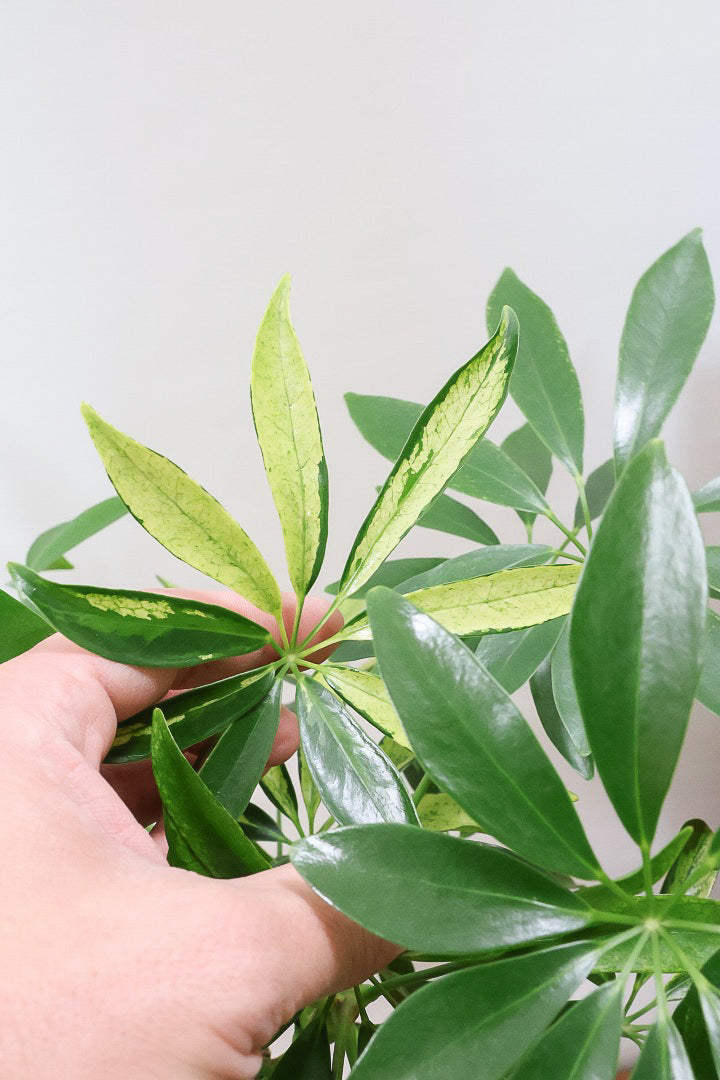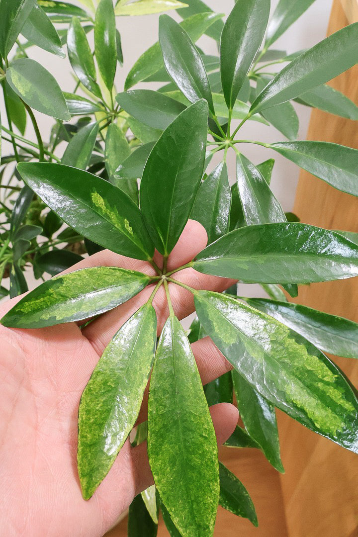 今回入荷のアッシュフォリアは2025年新登場のニューフェイス!葉のコントラストが抜群に美しいです!シェフレラの中でも比較的暗い場所にも強い品種ですので、育てやすさには自信をもってお勧めします!