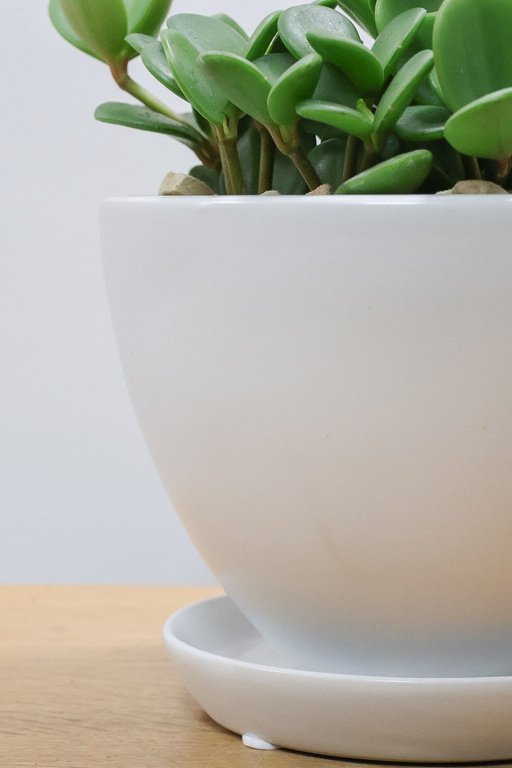 POTはマッドな質感のホワイトの陶器鉢。もちろん受け皿付きです!!
