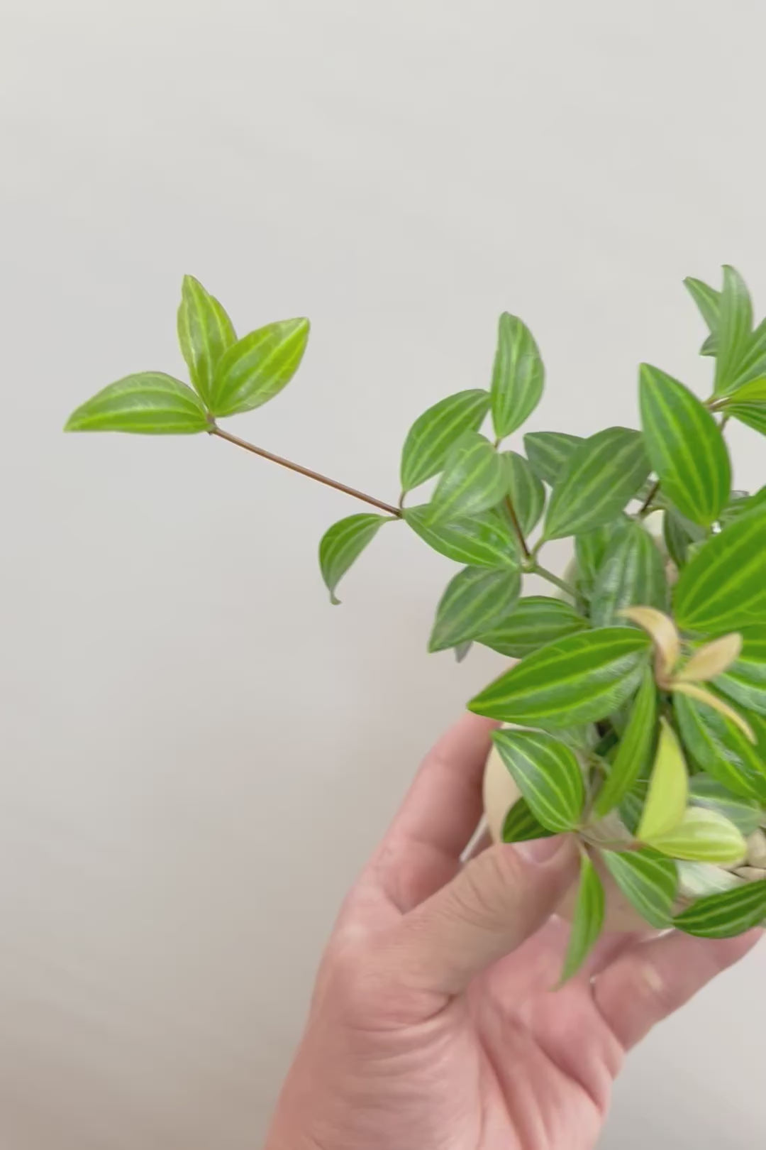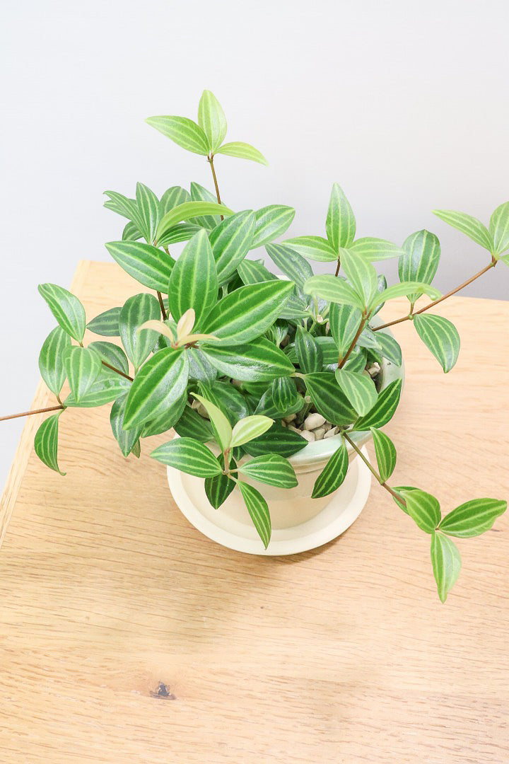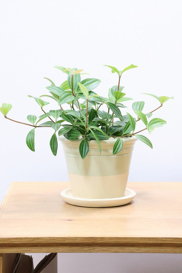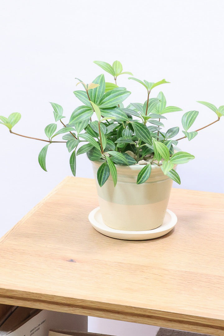 小さくてかわいい葉が人気のぺぺロミア♪葉っぱが小さくとてもキュート♪新芽はかわいいライム色でとてもきれいです♪ツル状にどんどん新芽を出して成長しますので、成長の過程が楽しめるペペロミア。お部屋のインテリアとしてぴったりの植物です。