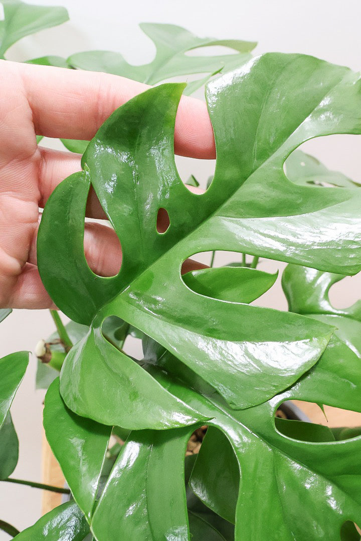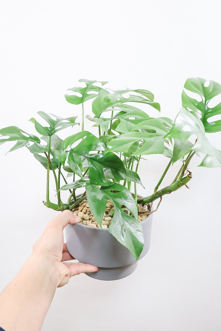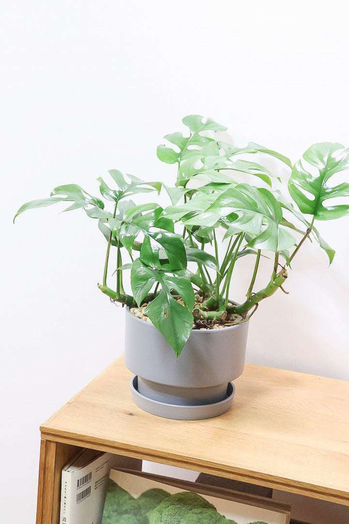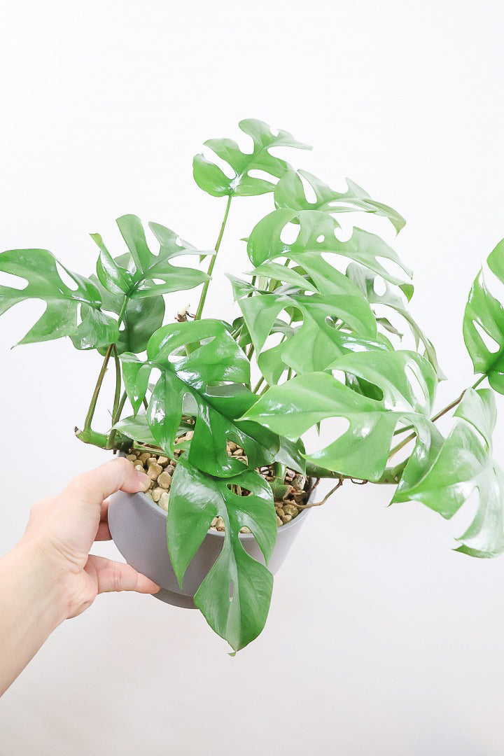 かわいい葉の切れ込みが特徴のモンステラ ミニマ。性質はとても健常で育てやすい観葉植物です。1枚1枚が異なる切れ込みが入りますので、生長とともに表情を楽しむことのできる人気の観葉植物です。長い時間けて生長し、葉を伸ばしてナチュラルな樹形に変化していくので生長が楽しみな植物です。時間の流れとともにお部屋に馴染んでいく観葉植物です。