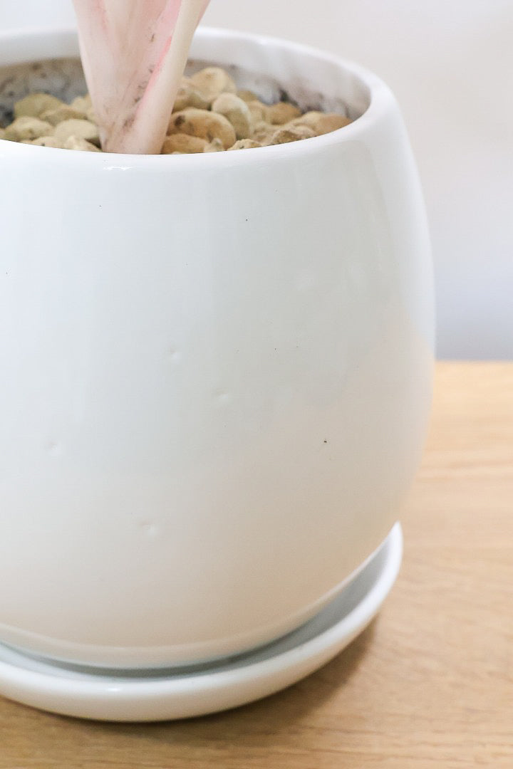 POTはマッドな質感のホワイトの陶器鉢。もちろん受け皿付きです!!