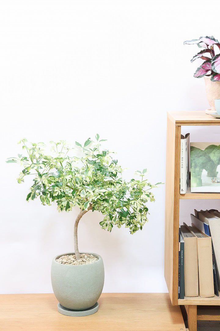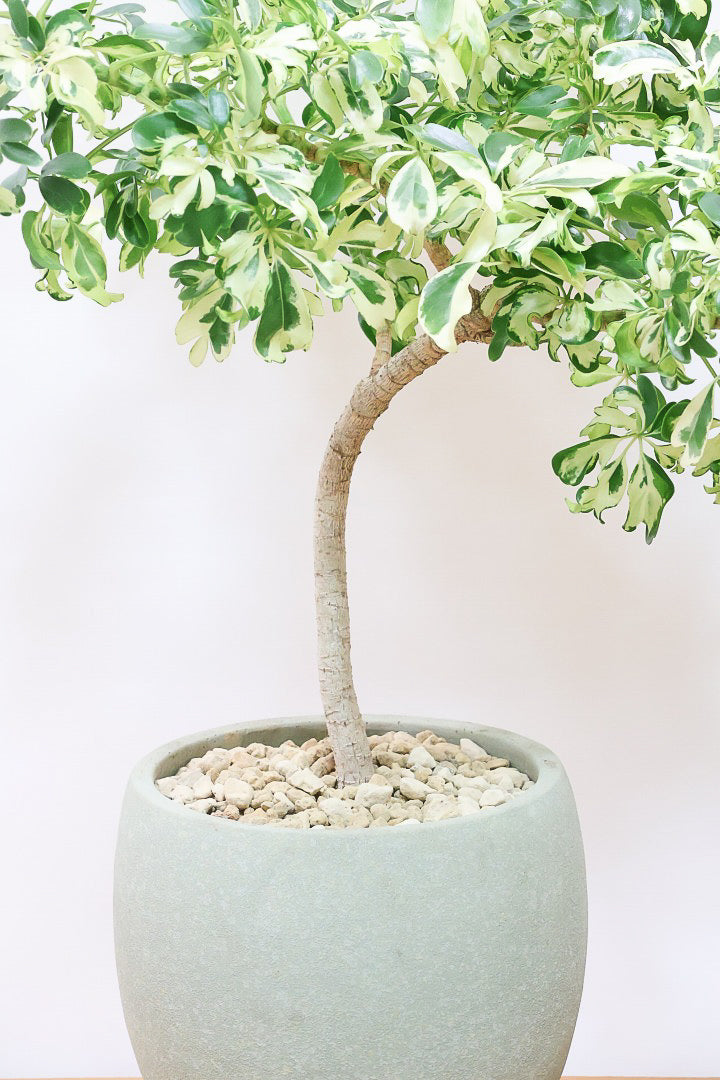 ジェニーネはその葉の鮮やかさから大人気のシェフレラ。シェフレラの中でも生長がゆっくりな品種ですのでここまでしっかりと作り込まれた樹形は希少です!
