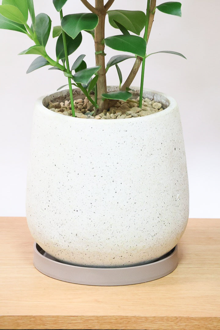 ファイバークレイ製の鉢です。こちらの商品の受け皿はプラスチック製となります。ファイバークレイとはガラス繊維から作られた耐久性に優れた素材です。