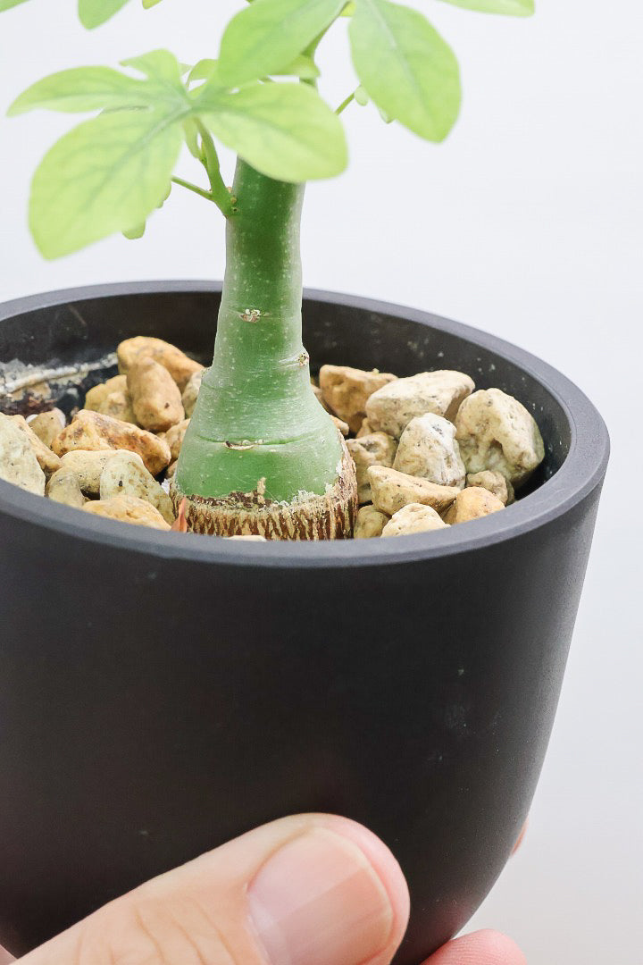 この植物は個性的な幹の中にたくさんの水分を蓄えており、乾燥にとても強い植物です。冬季の期間は葉が全て落葉し休眠します。休眠したら水やりをやめます。3月ごろまで断水します。4月ごろから水やりを始めることで新芽が出てきます。幹がとても個性的なフォルムなので落葉して幹だけになった姿もインテリア性があり、おすすめです!