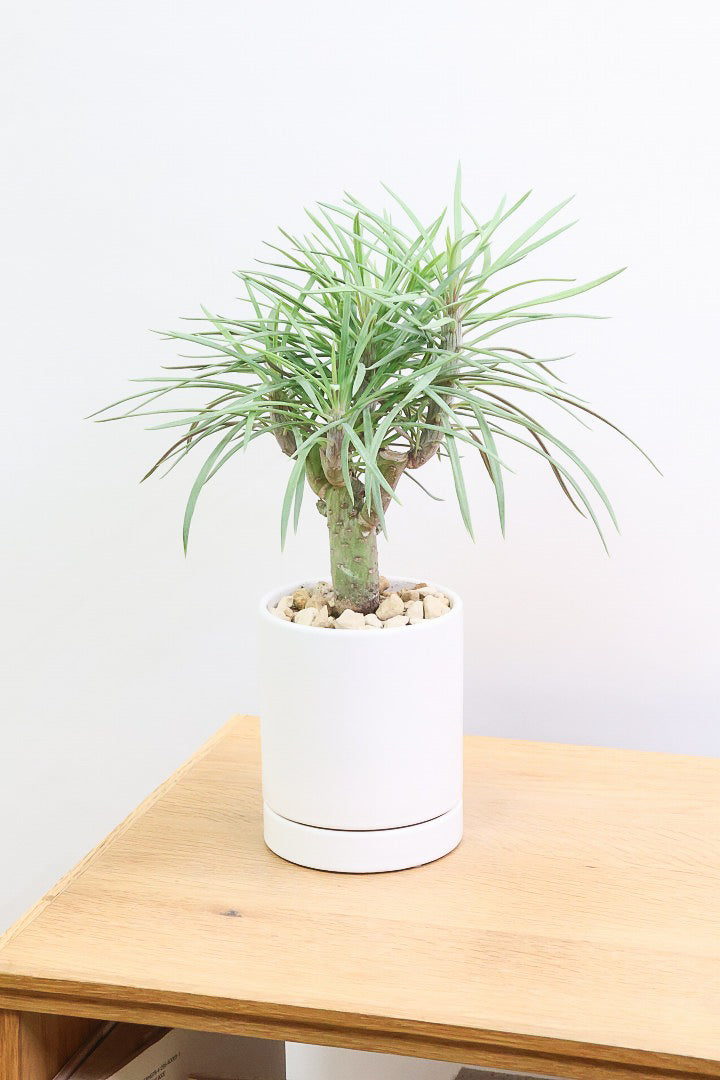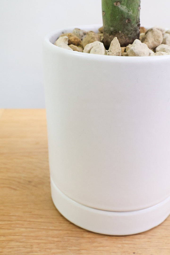POTはマッドな質感のホワイトの陶器鉢。もちろん受け皿付きです!!