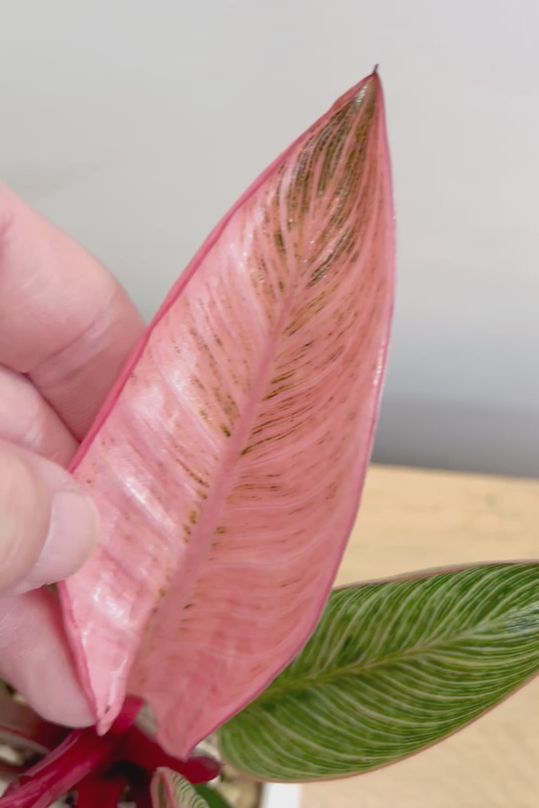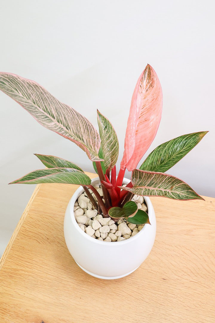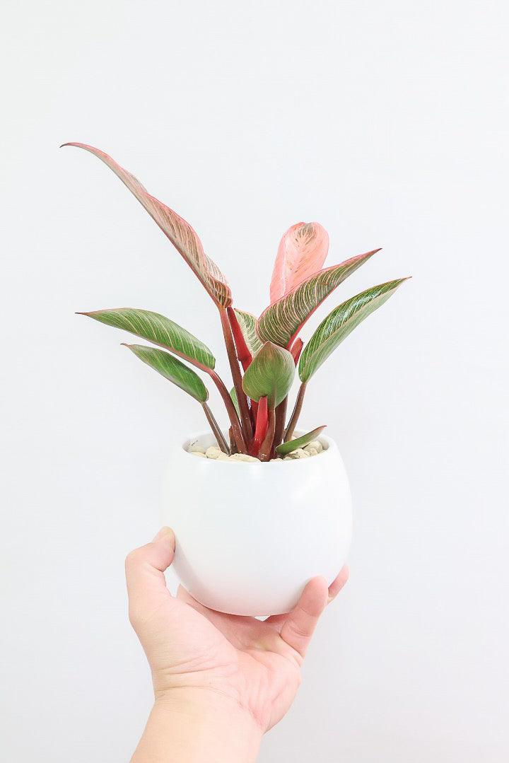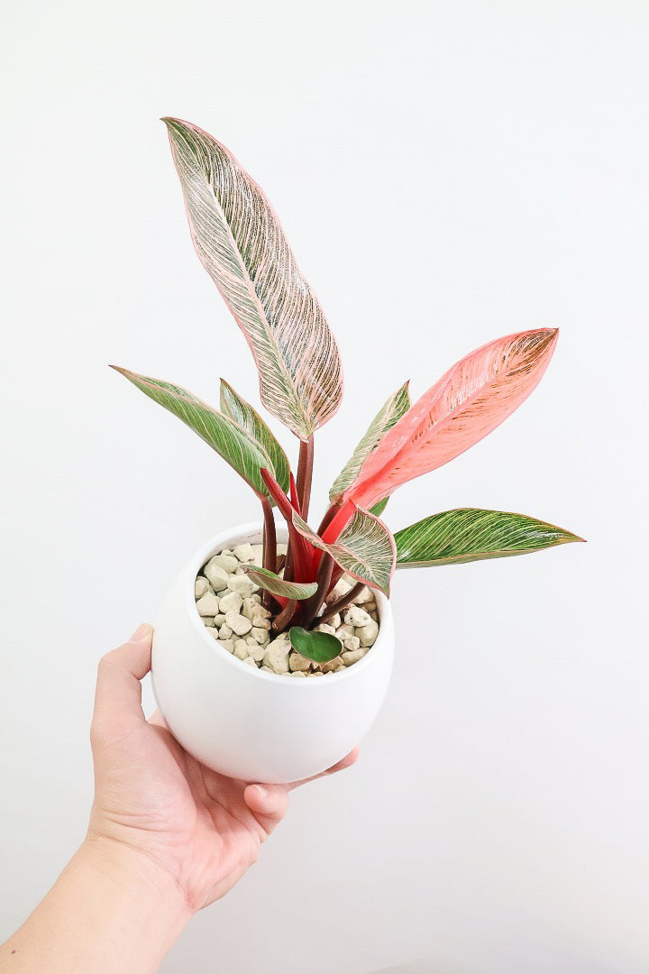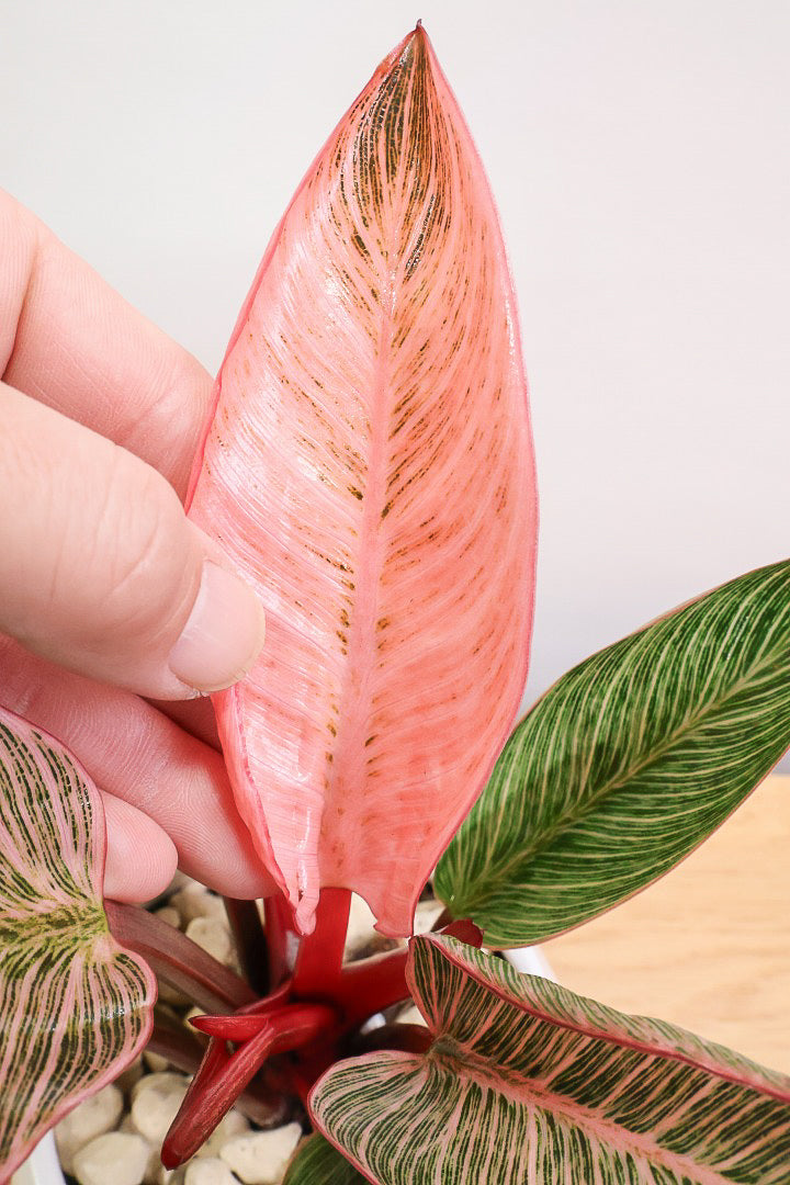 美しい葉が人気のフィロデンドロン。その中でもピンクバーキンはピンク&グリーンの葉で希少ななかなか出回らない品種です。長い時間けて生長し、葉を伸ばしていくので生長が楽しみな植物です。