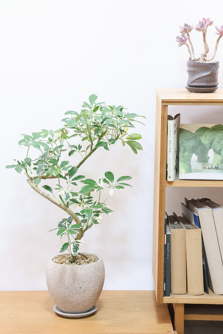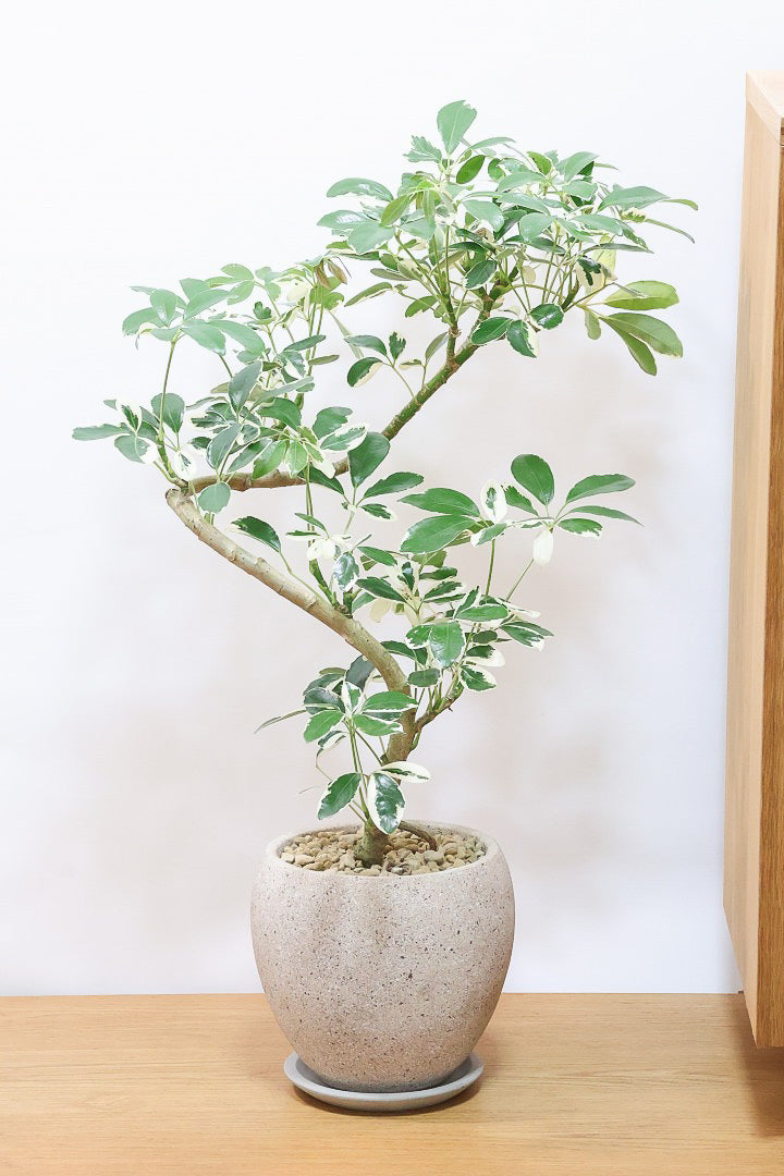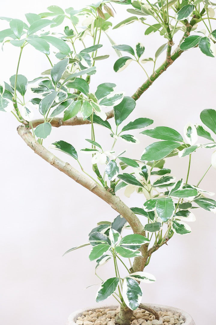 今回入荷のミルキーは何といってもホワイト&グリーンの葉色が人気のシェフレラです。樹形も生産者さんがこだわりぬいたカッコいい樹形となっております!