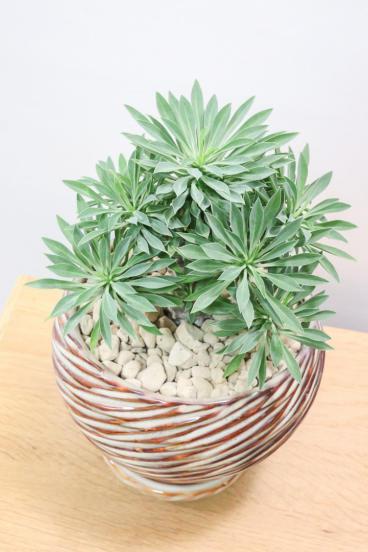 生長を見据えて選んだ陶器鉢は、3年程度植え替え不要。すぐに飾れる完成された姿でお届けします。